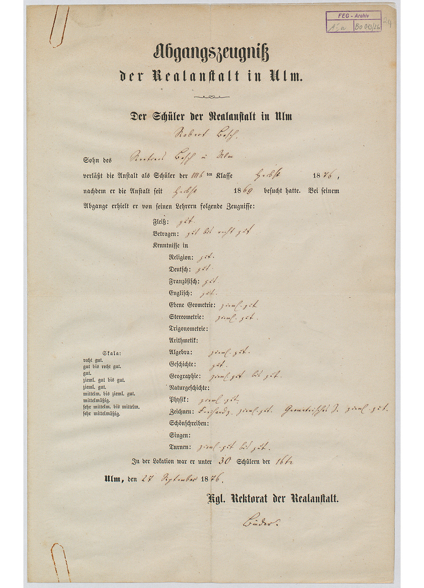 Robert Bosch's Abgangszeugnis der Realschule in Ulm aus dem Jahr 1876