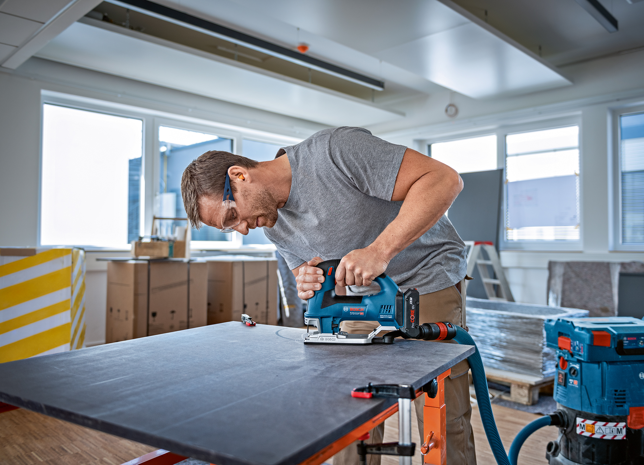 Bei der Bügelgriff-Version GST 18V-155 BC Professional lässt sich die Schnittgeschwindigkeit per Gasgebeschalter stufenlos regeln. So sorgt beispielsweise eine geringere Geschwindigkeit zu Beginn des Schnitts für höhere Präzision. Ihre neue Sägeblattführung verhindert selbst in engen Kurven, dass sich das Sägeblatt verbiegt. Dadurch sind exakte Kurven- und Freihandschnitte möglich. Das Gerät ist gut ausbalanciert und liegt bei Verwendung des empfohlenen ProCore18V-Akkus mit 4,0 Ah optimal in der Hand. Darüber hinaus bietet die GST 18V-155 BC Professional wie die Stabgriff-Version einen hohen Arbeits- und Gesundheitsschutz: Die neue und bei Stichsägen einzigartige „Drop Control“ schaltet das Gerät bei einem Sturz automatisch ab. Und wer möglichst staubarm arbeiten möchte, kann per Adapter einen Nass-/Trockensauger anschließen.