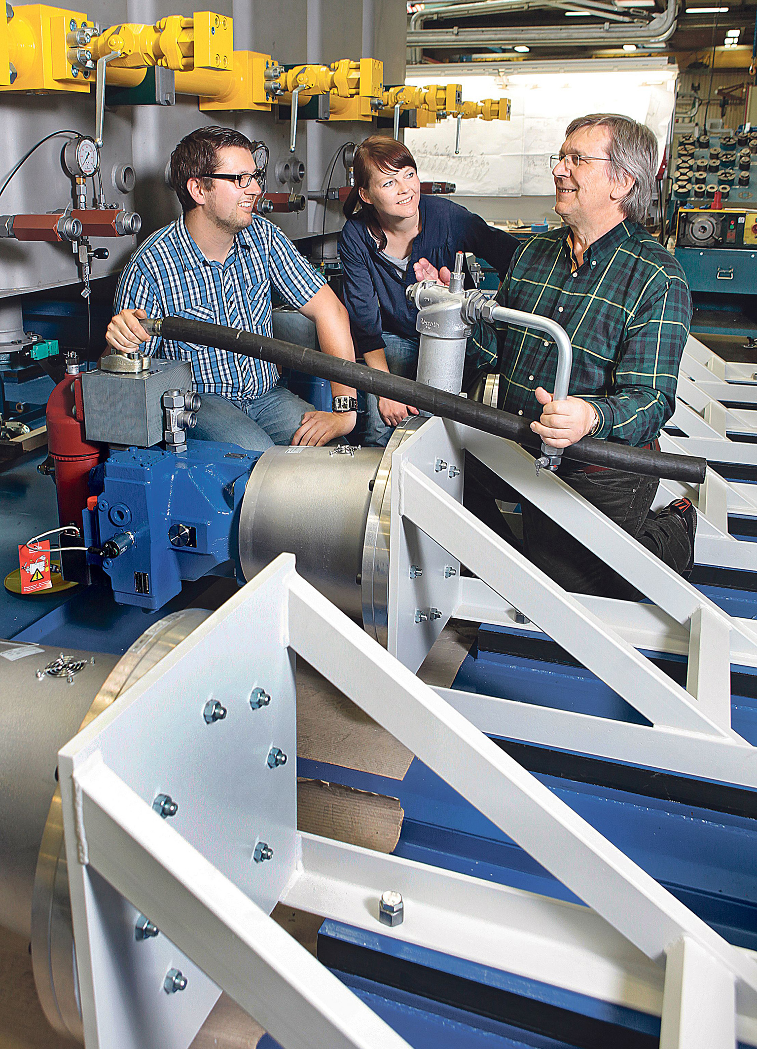 Seit 1999 sind bei Bosch ehemalige Mitarbeiter im Ruhestand als Seniorexperten zeitlich befristet für Beratungs- und Projektaufgaben im Einsatz. Mehr als 40 000 Jahre Know-how bringen weltweit alle 1 600 Pensionäre zusammen, die aktuell zum Expertenpool des Technologie- und Dienstleistungsunternehmens gehören. Das Foto zeigt Siegmund Kaiser (re.), 67, der als Seniorexperte für Hydraulik seine Kollegen Daniel Grus (li.) und Alexandra Künzel (mi.) bei einer Ausschreibung für Bühnentechnik unterstützt.