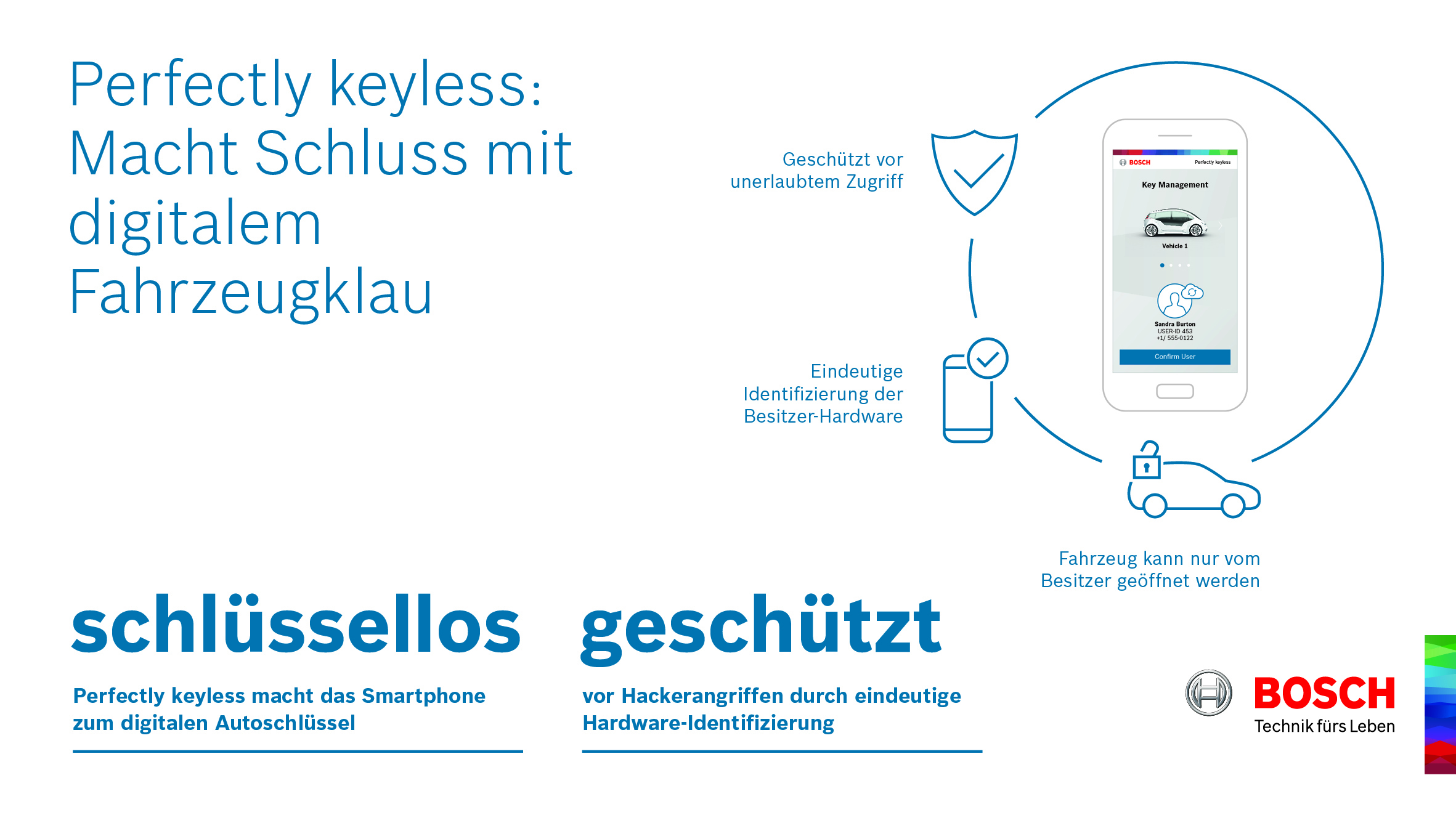Statt einer Funkübertragung im LF- oder UHF-Frequenzbereich (Low Frequency, Ultra High Frequency) nutzt das Bosch-System Bluetooth als Übertragungstechnologie. Diese Verbindung macht Bosch sicher wie einen Fingerabdruck. Möglich wird das durch Boschs jahrzehntelange Kompetenz im Bereich der Halbleiter.