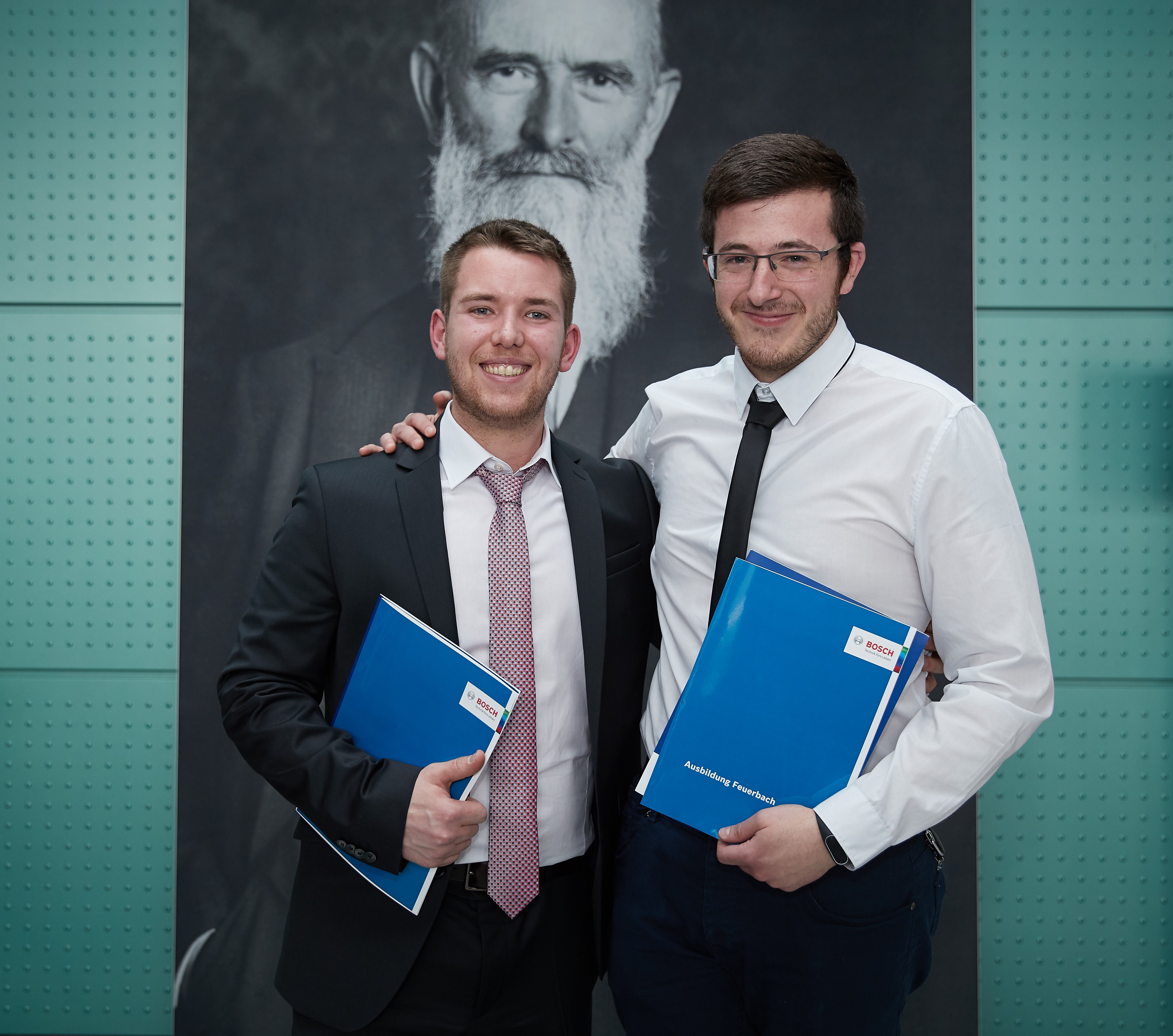Stolz hält der frisch gebackene Mechatroniker Juan Manuel Cañadas Torres (links) seine IHK-Urkunde in der Hand.