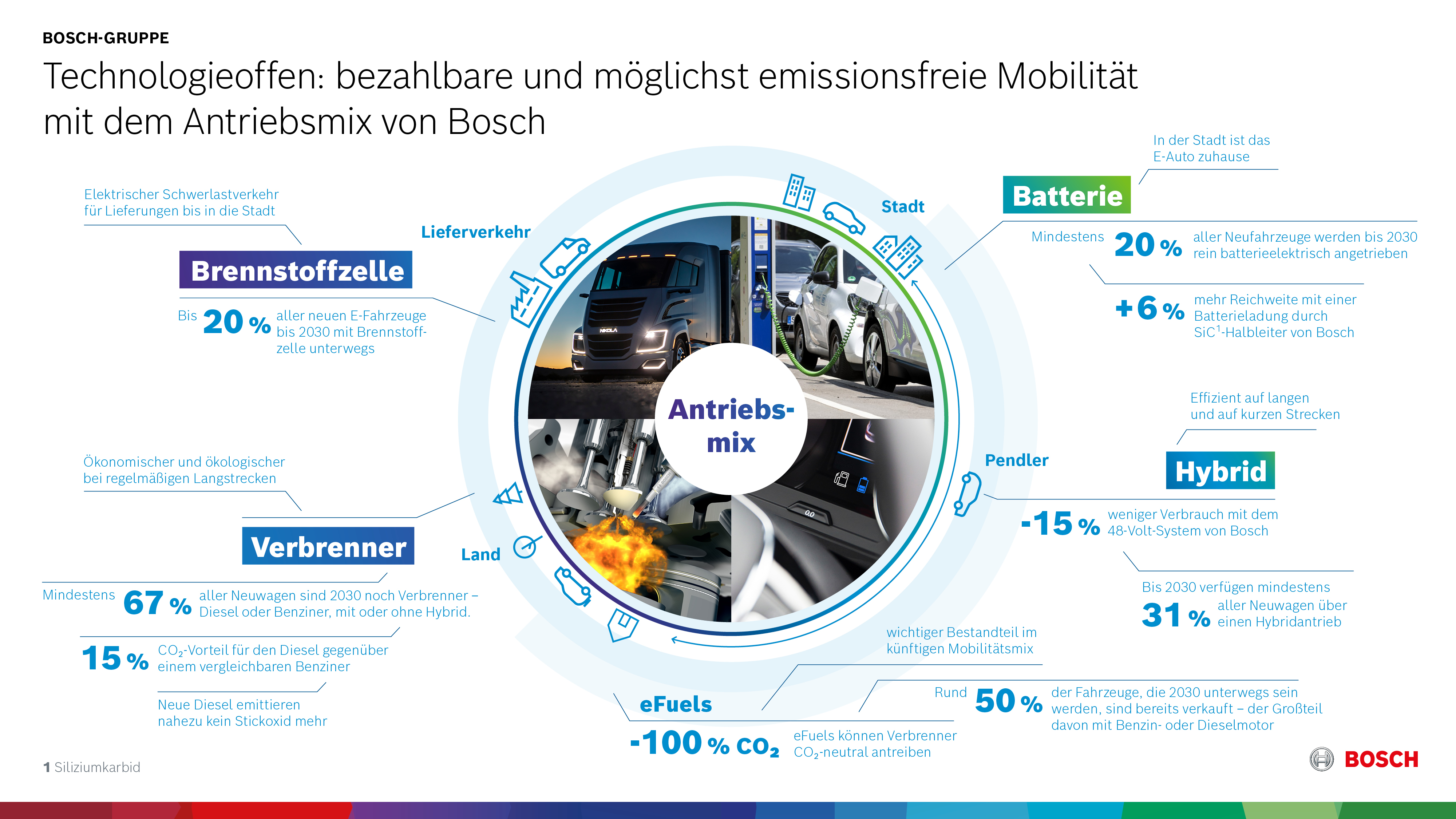 Bosch hat ein klares Bild von der Zukunft der Mobilität und wie die Mobilitätswende gelingen kann. Aufgrund seines Portfolios ist das Technologie- und Dienstleistungsunternehmen wie kaum ein anderes auf die verschiedenen Entwicklungen und Szenarien vorbereitet. Bosch geht die Zukunft der Mobilität technologieoffen an, entwickelt konventionelle Antriebe weiter und forciert die Elektrifizierung. Das Ziel: Die Mobilität der Zukunft soll keine negativen Auswirkungen auf Klima und Luftqualität haben und für die breite Bevölkerung bezahlbar bleiben. Möglich wird das mit einem Antriebsmix aus hocheffizienten Verbrennungs- und modernsten Elektromotoren. Zudem setzt sich Bosch für den Einsatz von regenerativen und synthetischen Kraftstoffen ein, damit auch der bereits vorhandene Fahrzeugbestand einen Beitrag zur CO2-Reduzierung leisten kann.