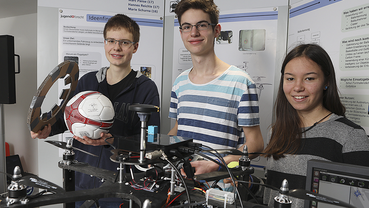 Thema des Projekts: Autonomer Apportiercopter für Bälle, Teilnehmer: Marc Panse, Hannes Reichle, Marie Schurna
