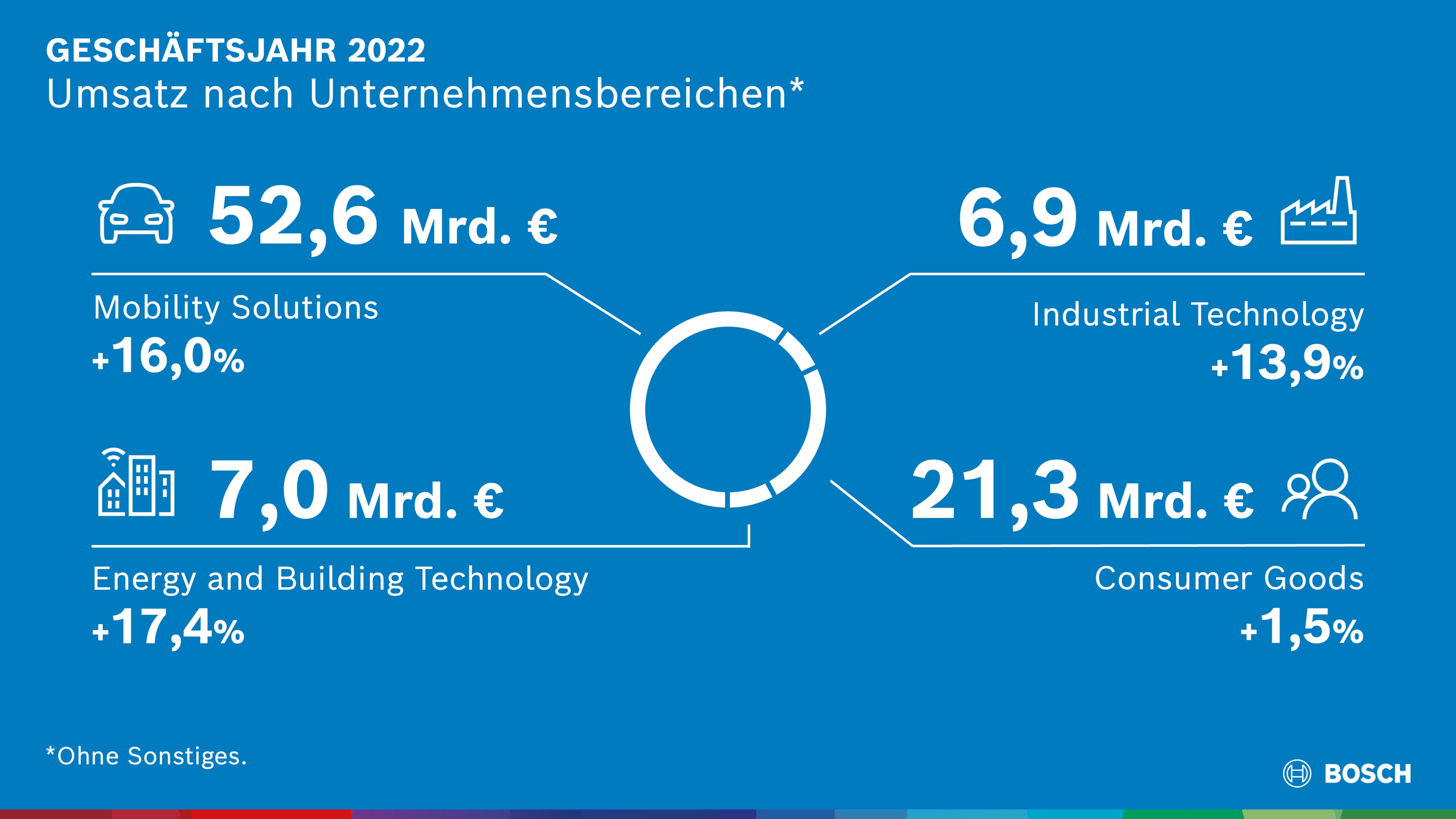 Bosch hat im herausfordernden Jahr seine Geschäftsziele übertroffen: Das Technologie- und Dienstleistungsunternehmen steigerte seinen Gesamtumsatz auf 88,2 Milliarden Euro. Das ist ein Plus von 12,0 Prozent. In Nordamerika erhöhte sich der Umsatz um 25,7 Prozent auf 14,4 Milliarden Euro. In Südamerika erreichte der Umsatz 1,8 Milliarden Euro. Das Wachstum lag bei 26,0 Prozent. In Europa stieg der Umsatz 7,3 Prozent über dem Vorjahr und erreichte 44,3 Milliarden Euro. In Asien-Pazifik einschließlich übriger Regionen stiegen die Erlöse um 12,8 Prozent auf 27,7 Milliarden Euro.