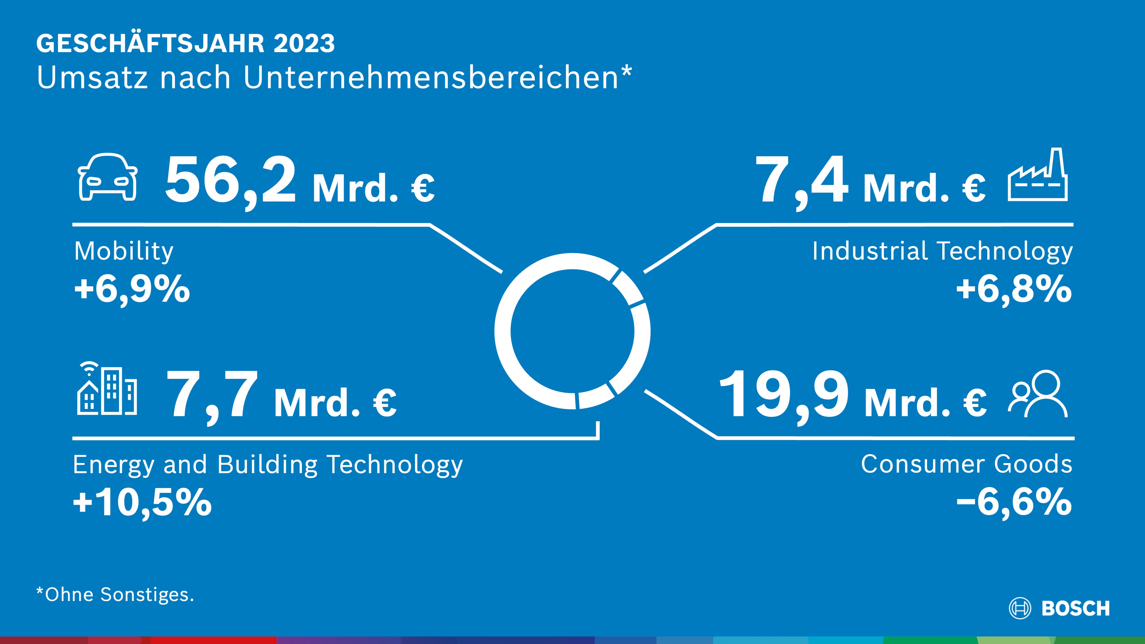 Die Bosch-Gruppe hat ihren Umsatz und Ertrag 2023 gesteigert und setzt ihre Wachstumsstrategie erfolgreich um: Das Technologie- und Dienstleistungsunternehmen erwirtschaftete trotz ungünstiger Konjunktur- und Marktbedingungen einen Umsatz von 91,6 Milliarden Euro. Dies ist ein Anstieg von 3,8 Prozent, wechselkursbereinigt ein Plus von 8,0 Prozent. Der Unternehmenssektor Mobility erzielte ein Umsatzwachstum von 6,9 Prozent auf 56,2 Milliarden Euro. Wechselkursbereinigt beträgt das Plus 10,9 Prozent. Im Unternehmensbereich Industrial Technology stiegen die Erlöse auf 7,4 Milliarden Euro. Der Anstieg um 6,8 Prozent und wechselkursbereinigt um 10,2 Prozent resultiert aus der erstmaligen Konsolidierung der Zukäufe HydraForce und Elmo Motion Control. Im Unternehmensbereich Consumer Goods lag der Umsatz 6,6 Prozent unter Vorjahr und erreichte 19,9 Milliarden Euro, wechselkursbereinigt ein leichtes Minus von 1,2 Prozent. Im Unternehmensbereich Energy and Building Technology legte der Umsatz um 10,5 Prozent auf 7,7 Milliarden Euro zu, wechselkursbereinigt ein Wachstum von 13,2 Prozent.