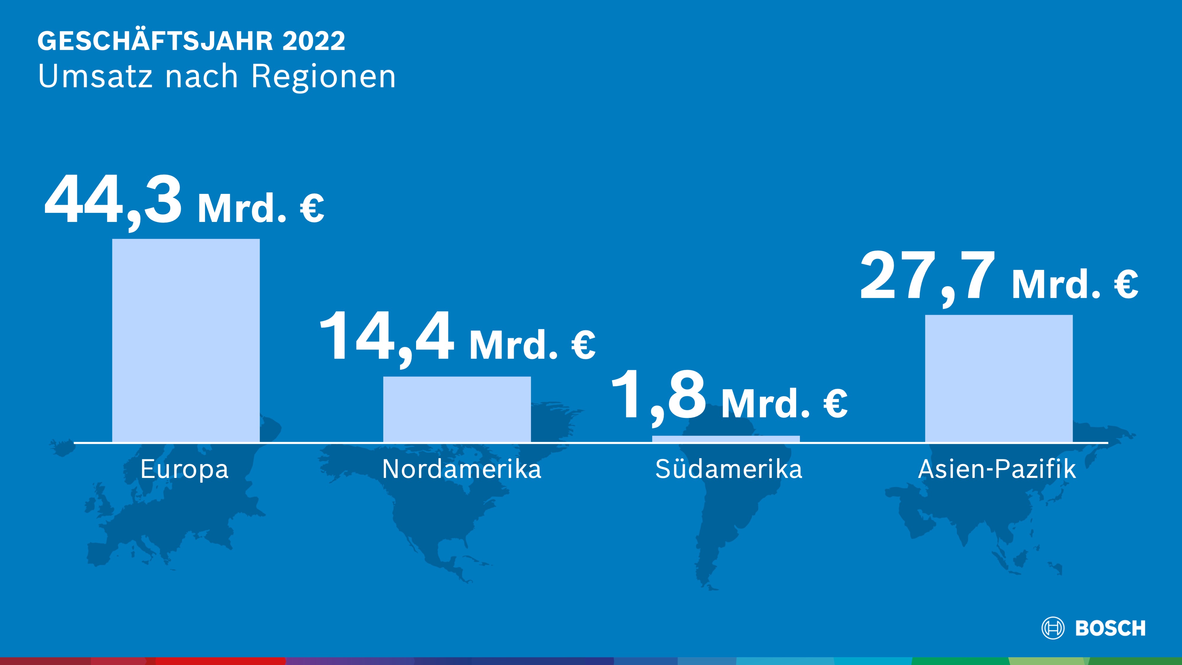 Bosch hat im herausfordernden Jahr seine Geschäftsziele übertroffen: Das Technologie- und Dienstleistungsunternehmen steigerte 2022 seinen Gesamtumsatz auf 88,2 Milliarden Euro. Das ist ein Plus von 12,0 Prozent. In Nordamerika erhöhte sich der Umsatz um 25,7 Prozent auf 14,4 Milliarden Euro. In Südamerika erreichte der Umsatz 1,8 Milliarden Euro. Das Wachstum lag bei 26,0 Prozent. In Europa stieg der Umsatz 7,3 Prozent über dem Vorjahr und erreichte 44,3 Milliarden Euro. In Asien-Pazifik einschließlich übriger Regionen stiegen die Erlöse um 12,8 Prozent auf 27,7 Milliarden Euro.