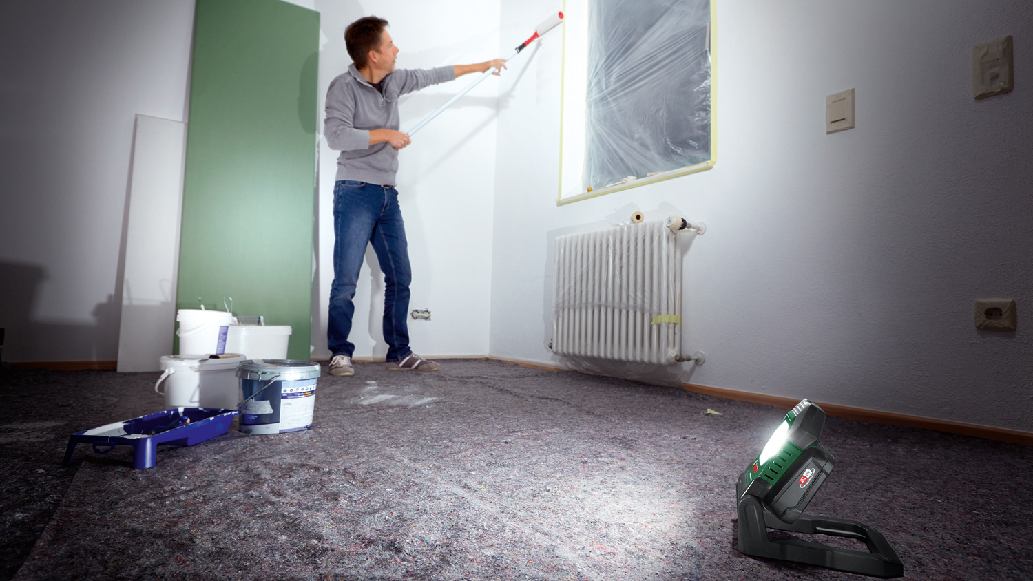 Mit den im Handgriff integrierten Metallhaken kann die akku-betriebene LED-Arbeitsleuchte an Türen oder Fenstern eingehängt werden, um beispielsweise einen Raum zum Tapezieren und Streichen auszuleuchten. Die Magnete im Handgriff ermöglichen eine Befestigung an magnetischen Oberflächen von Türzargen, Treppengeländern oder Heizkörpern. Der schwenkbare Leuchtkopf lässt sich am Standfuß, der gleichzeitig als Griff dient, in zehn unterschiedlichen Stufen positionieren – das erlaubt eine flexible Ausrichtung, ganz gleich, ob die Leuchte steht, hängt oder magnetisch haftet.