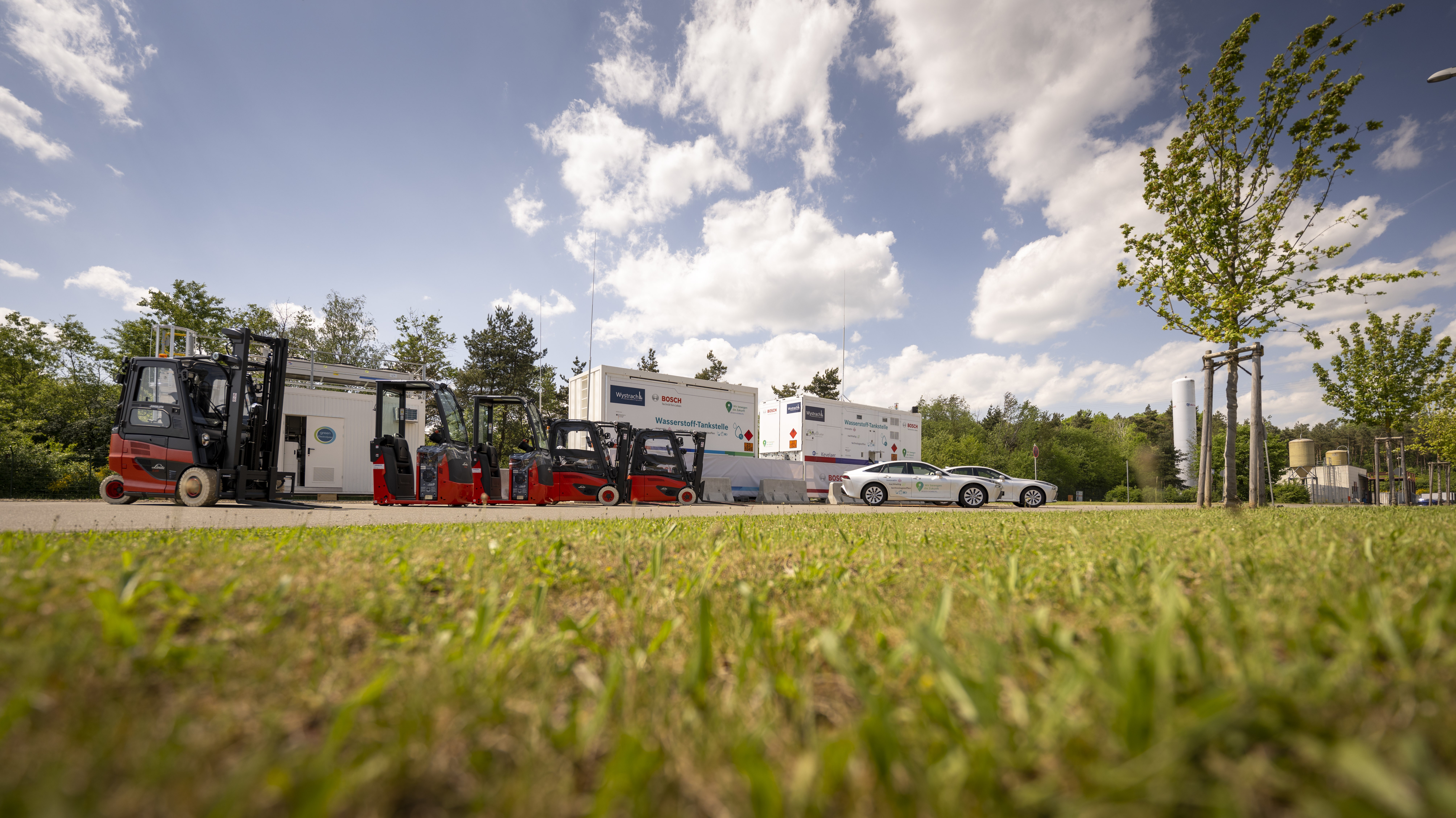 Im Wasserstoffkreislauf im Bosch-Werk in Homburg produziert ein Elektrolyseur Wasserstoff, der künftig für die Produktion und Mobilität genutzt wird. Brennstoffzellenfahrzeuge tanken Wasserstoff, die für den Werksverkehr und die Produktion eingesetzt werden.