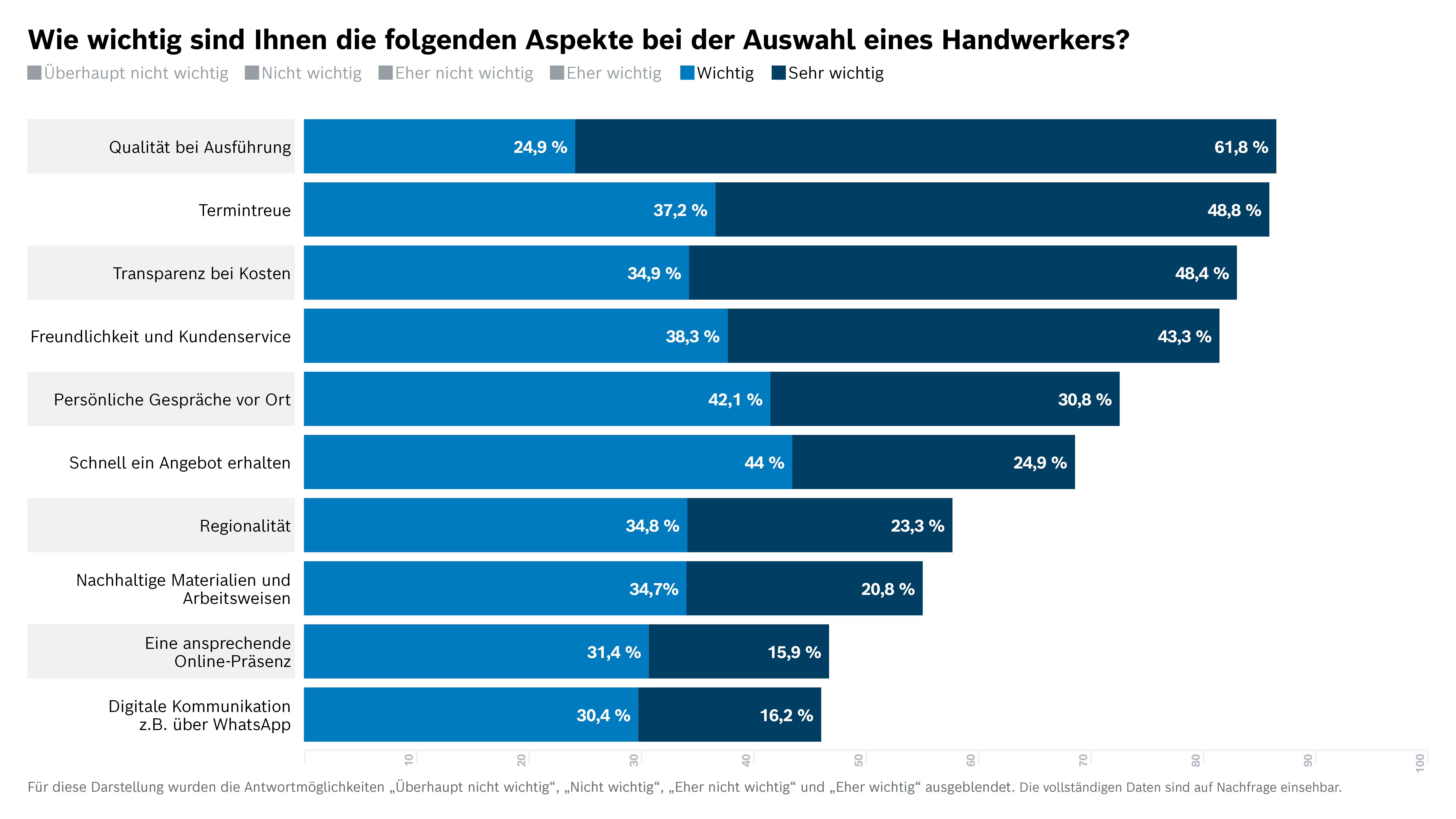 Die unter Mehrfachauswahl für Kunden wichtigsten Aspekte sind die Qualität (86,7 %), Termintreue (86 %) und transparente Kosten (83,3 %). In Zeiten des Klimawandels legen Kunden aber auch zunehmend Wert auf Nachhaltigkeit. 55,5 % der Befragten erachten die Verwendung nachhaltiger Materialien und Arbeitsweisen als wichtig oder sehr wichtig. Gleichzeitig gewinnen auch andere zeitgemäße Aspekte an Bedeutung. So wird die digitale Kommunikation, beispielsweise über WhatsApp, von einem beachtlichen Teil der Befragten (46,6 %) geschätzt.