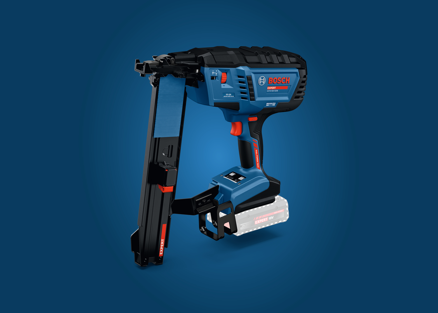 Der Akku-Klammerer EXPERT EXTH18V-50M setzt marktübliche 16-Gauge-Klammern mit einer Drahtstärke von 1,6 Millimetern, einer Rückenbreite von 11,3 Millimetern (KG700, verbreitet in Europa) oder 10,8 Millimetern (Senco N/G5562), einer Länge von 25 bis 50 Millimetern und einem Magazinwinkel von 0 Grad.