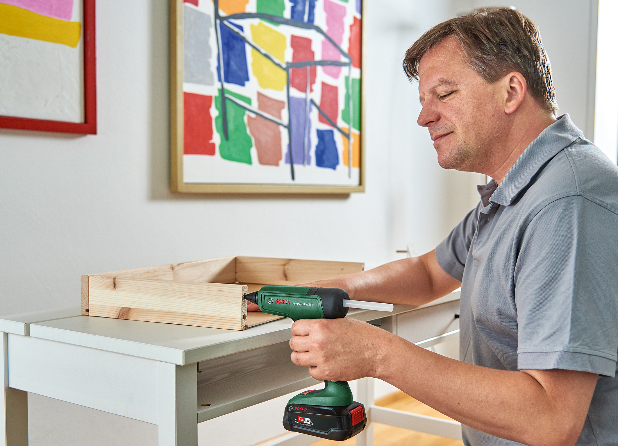 Die Akku-Heißklebepistole AdvancedGlue 18V von Bosch verfügt über zwei Temperatureinstellungen: Mit der Niedertemperatur von 130 Grad Celsius können hitzeempfindliche Materialien verarbeitet werden. Die Hochtemperatur von 200 Grad Celsius ermöglicht starke Klebeverbindungen, zum Beispiel für Sockelleisten, Schubladen oder Dekorplatten. Mit einer Akku-Ladung von 2,5 Ah schafft die AdvancedGlue 18V einen Durchsatz von zehn Klebesticks. Der präzise zu bedienende Vorschubhebel ermöglicht eine exakte Dosierung der Klebstoffmenge. Modellbauern und Heimwerkern, die auf einen akkuraten Klebstoffauftrag angewiesen sind, erlaubt die extra lange Dosierspitze besonders präzises und kontrolliertes Auftragen des Klebstoffs.