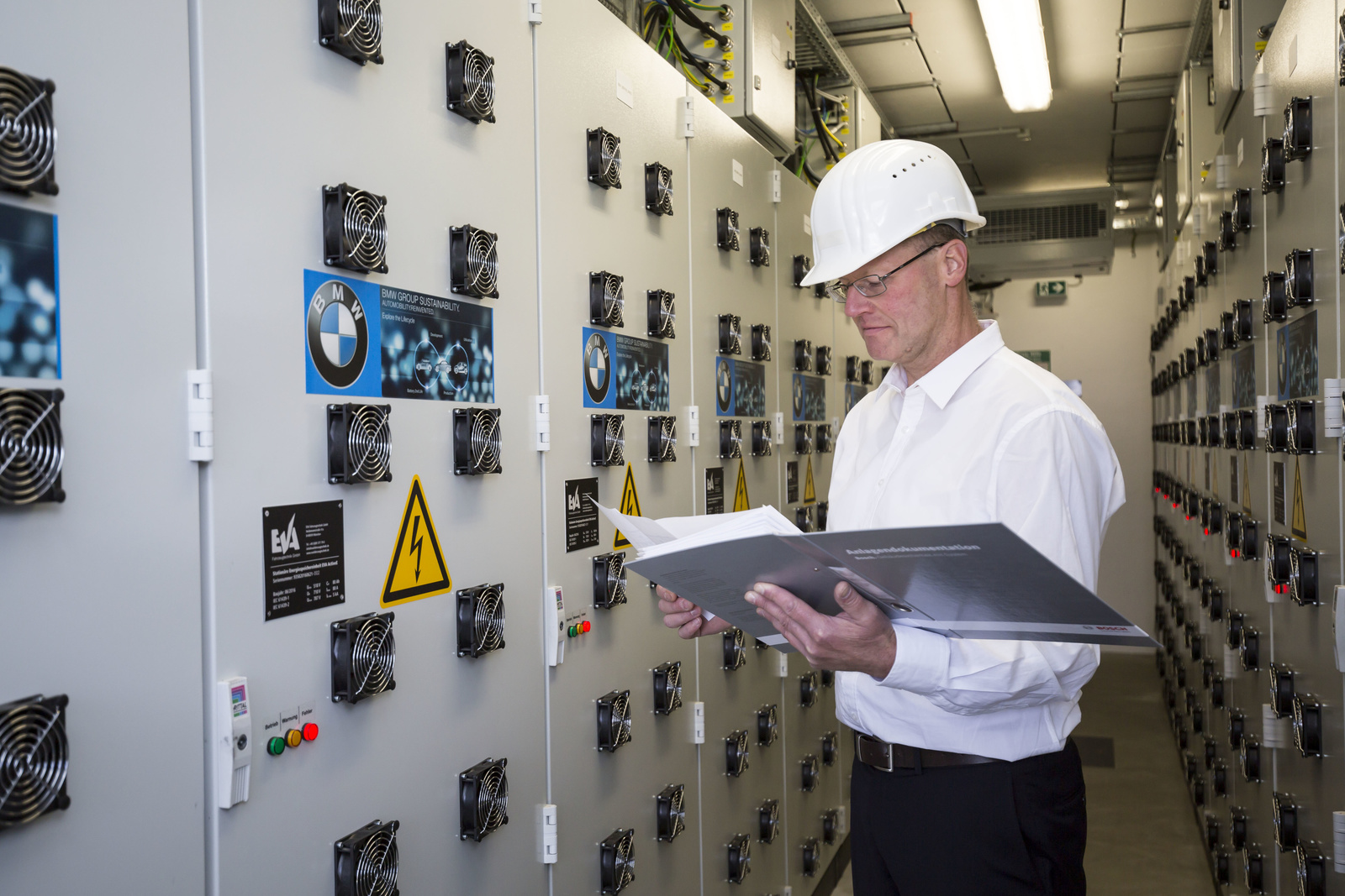 A second life for used electric vehicle batteries: Ralf Gaudig, Technical project manager at Bosch is checking the facility. Bosch’s electricity storage in Hamburg, Germany, contains 2,600 used battery modules from over 100 electric vehicles.