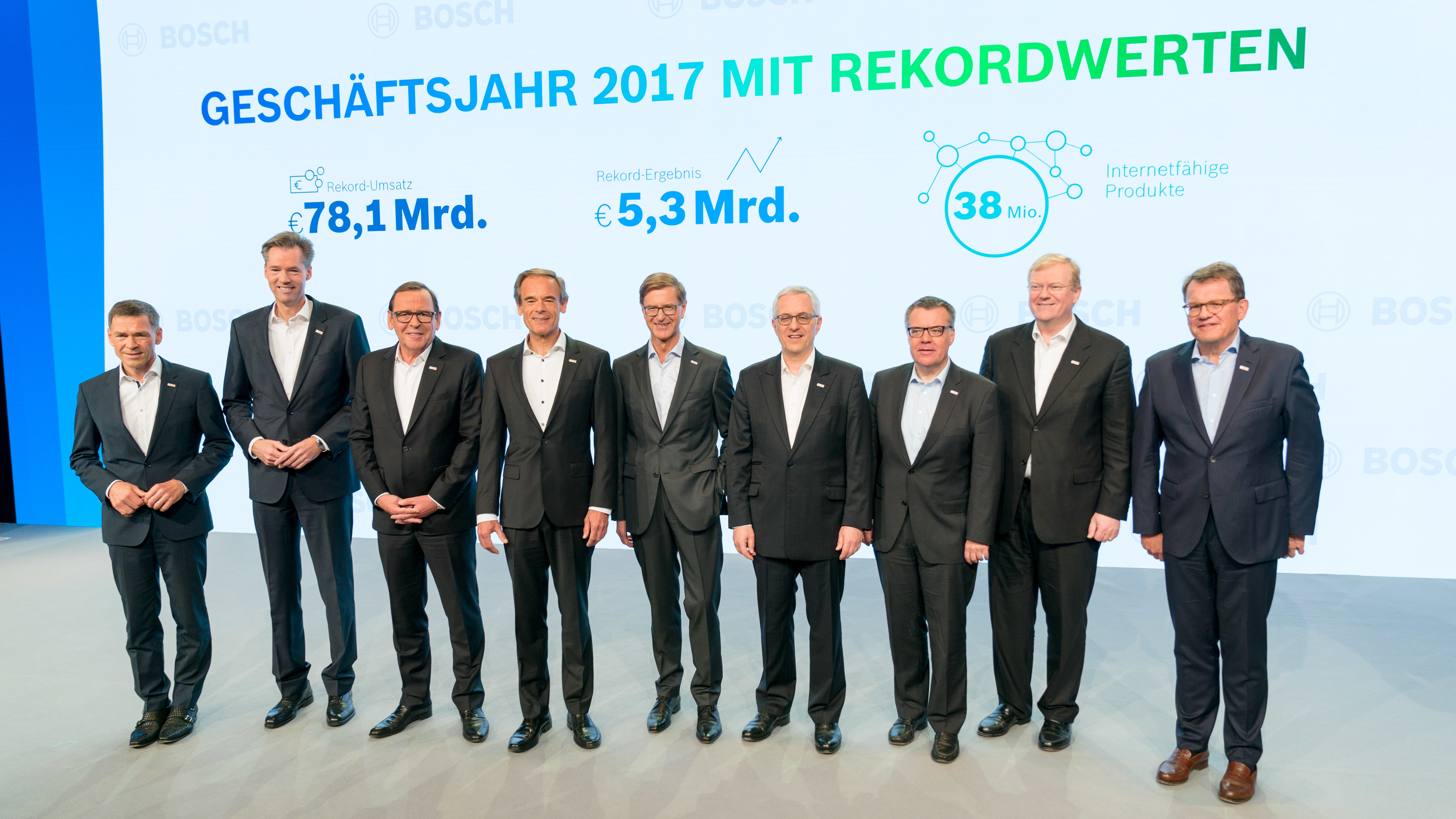 Today Bosch presented it’s corporate key figures for financial 2017 and the first months of 2018 at the Bosch R&D center in Renningen. The Board of Management, left to right. Christoph Kübel, Dr. Markus Heyn, Peter Tyroller, Dr. Volkmar Denner (chairman), Prof. Stefan Asenkerschbaumer (deputy chairman), Dr. Dirk Hoheisel, Dr. Rolf Bulander, Dr. Stefan Hartung, Uwe Raschke.