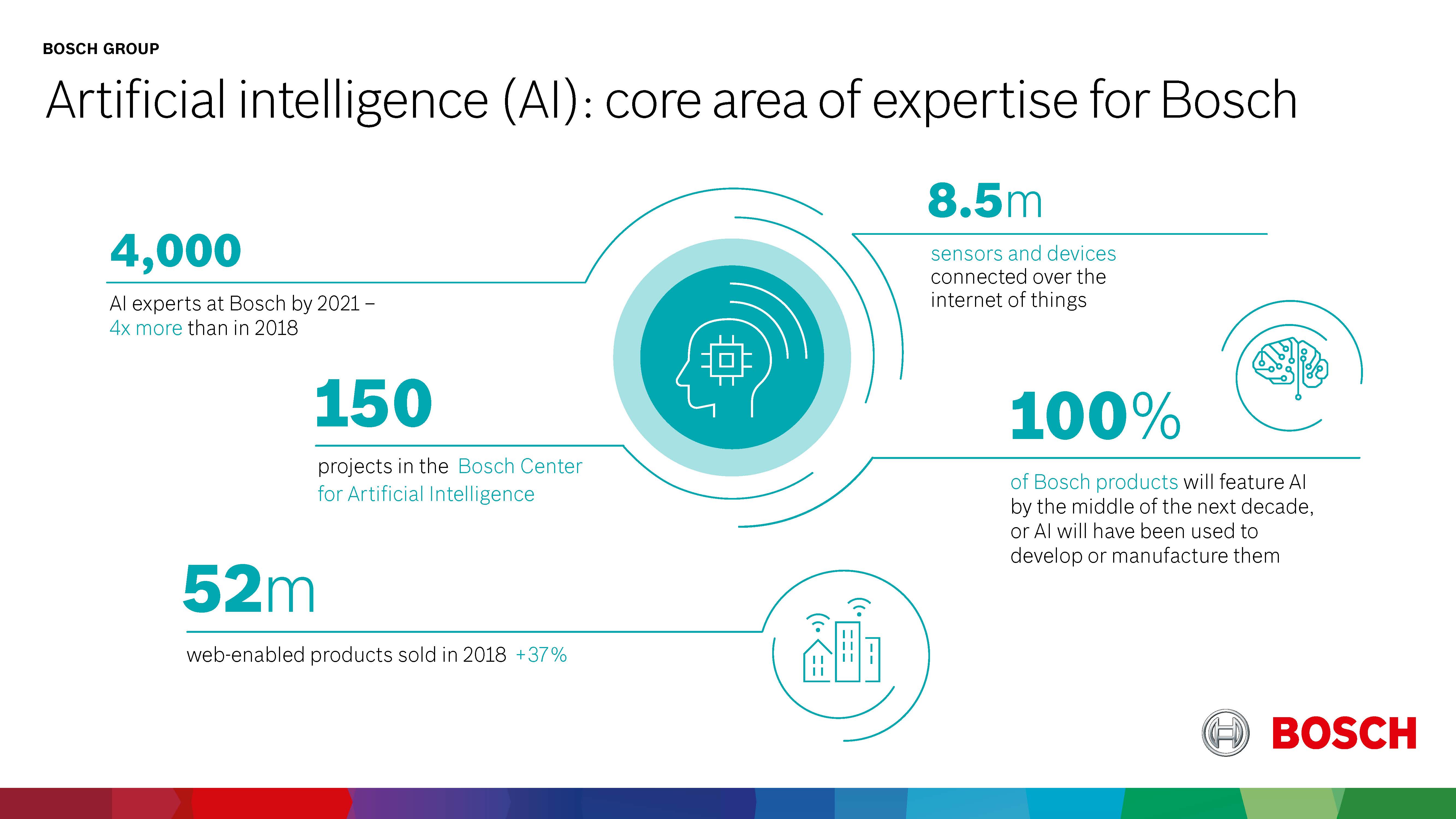 Bosch views artificial intelligence (AI) as a core area of expertise. The technology and services company aims to be a world leader in AI innovation: by 2021, Bosch plans to quadruple the number of its in-house AI experts from 1,000 to 4,000. By the middle of the next decade, 100 percent of Bosch products will be equipped with AI, or AI will have played a part in their development and manufacture. Associates at the Bosch Center for Artificial Intelligence are currently working on nearly 150 AI projects. AI is also a key technology for the internet of things (IoT): in 2018, Bosch sold a total of 52 million web-enabled products, 37 percent more than in the previous year.