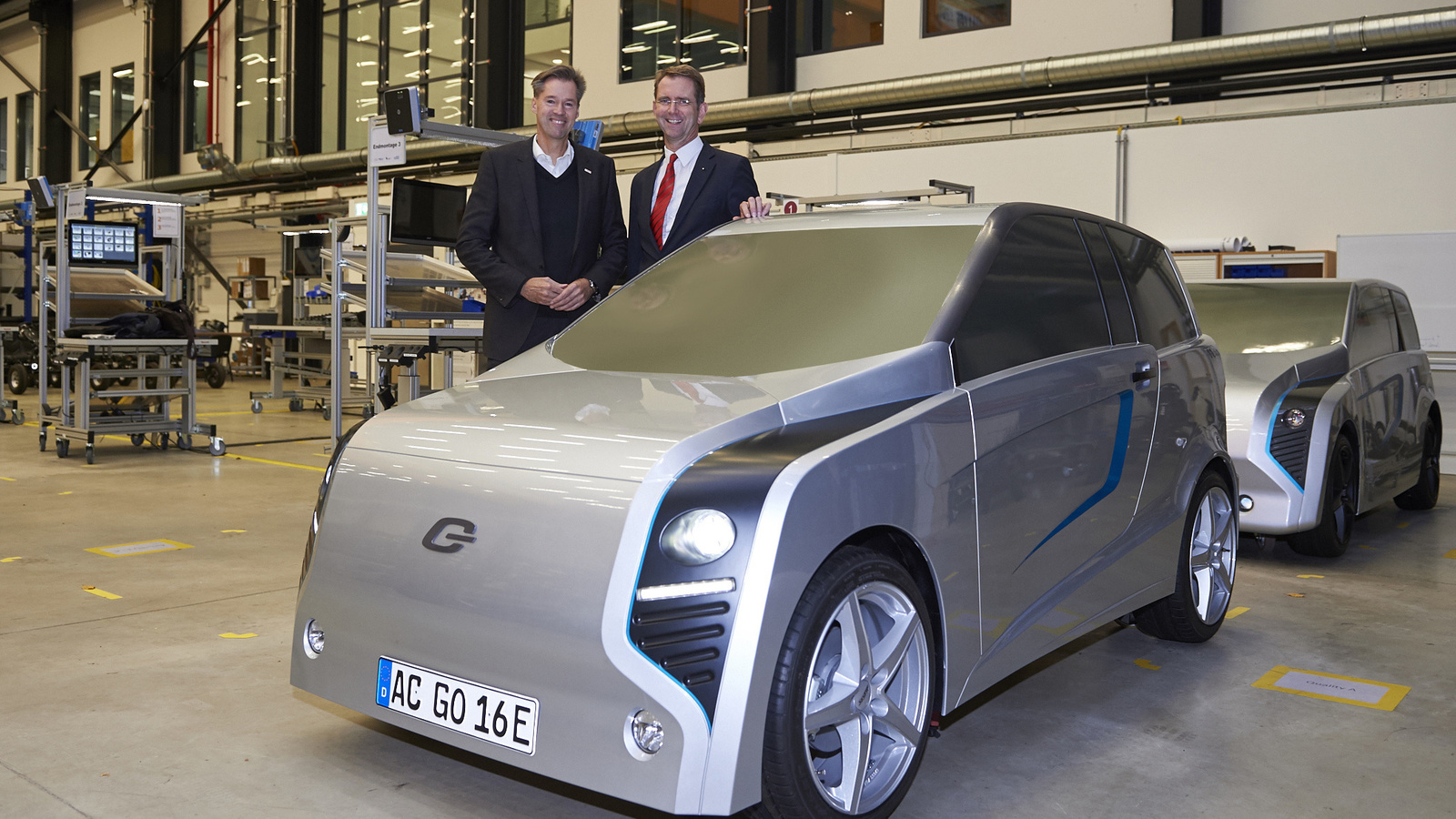 The e.GO Life design prototype: Dr. Markus Heyn, member of the Bosch board of management, and Prof. Guenther Schuh, CEO e.GO Mobile AG