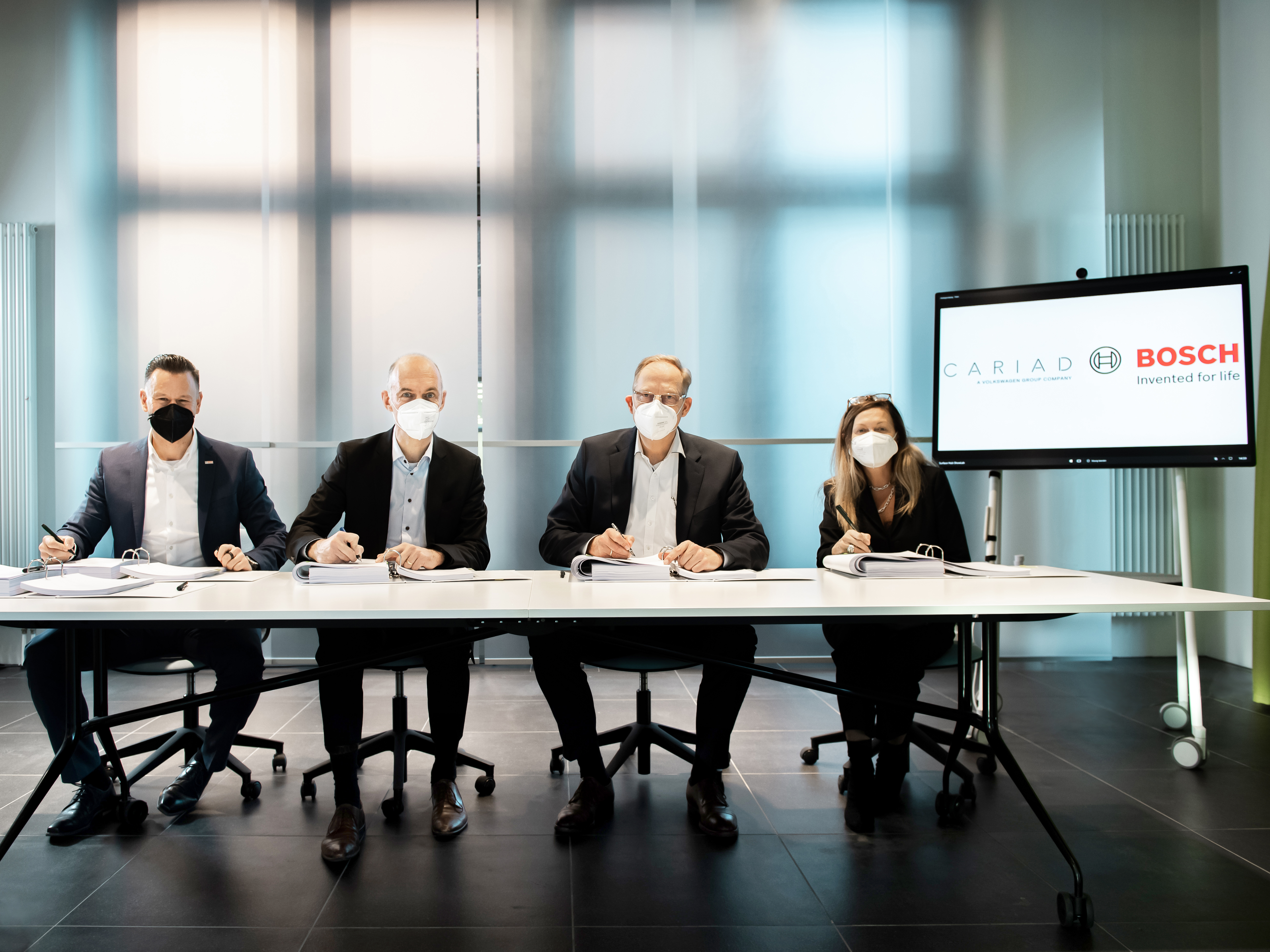 Dr. Thomas Irawan, senior vice president of Driver Experience for Advanced Driver Assistance Systems business unit at Robert Bosch GmbH; Dr. Mathias Pillin, president of Bosch Cross-Domain Computing Solutions; Dirk Hilgenberg, Cariad CEO; Lynn Longo, Cariad CTO (left to right) at the signature ceremony.