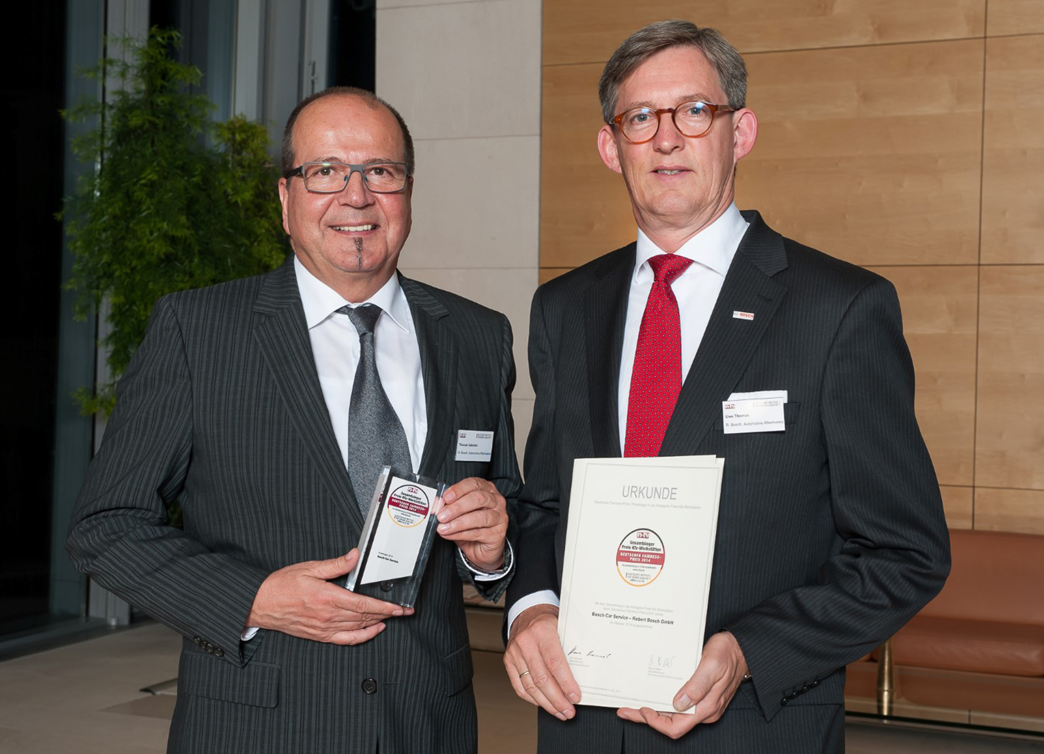 From right to left: Dr. Uwe Thomas, president of the Bosch Automotive Aftermarket division, and Thomas Salender, spokesman of the Bosch Service Strategy Committee and representative for the Bosch Services, received the award in Berlin.