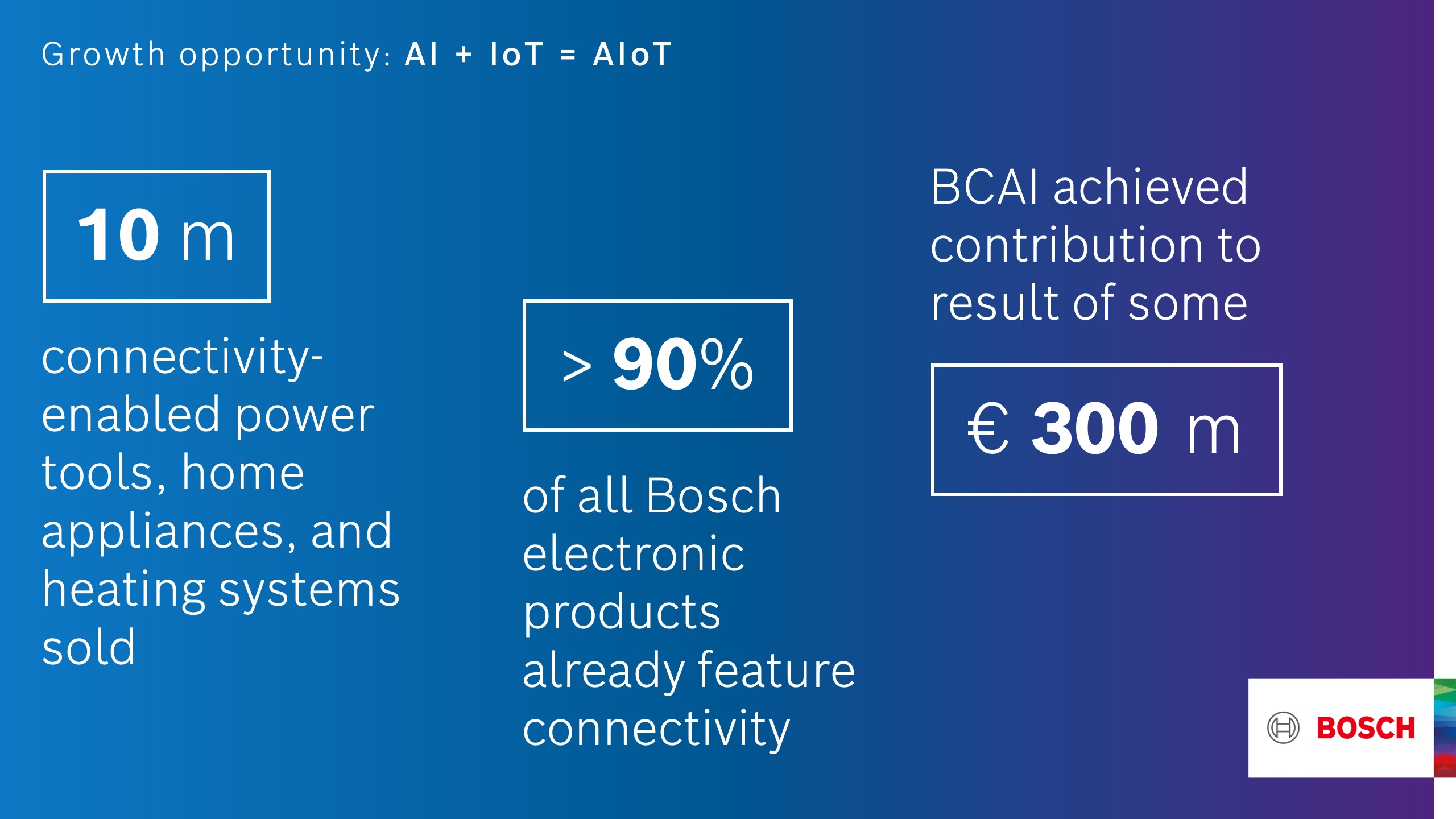 By combining artificial intelligence (AI) and the Internet of Things (IoT), Bosch wants to carve out a position in a market worth billions. With innovative AIoT solutions, the company will create additional benefit for customers by lowering energy costs and increasing comfort and safety. Bosch has already sold some ten million connectivity-enabled power tools, home appliances, and heating systems, and the number of active users is growing. Already, more than 90 percent of all Bosch electronic products feature connectivity. To build on its expertise in the field of artificial intelligence, the company founded the Bosch Center for Artificial Intelligence, or BCAI, in early 2017 – and now considers itself to be in a strong position: just three years after it was set up, the initial investment had paid off; BCAI’s contribution to result is now around 300 million euros. BCAI currently employs a total of some 270 AI specialists working on more than 180 projects in the domains of mobility, manufacturing, smart homes, and agriculture.