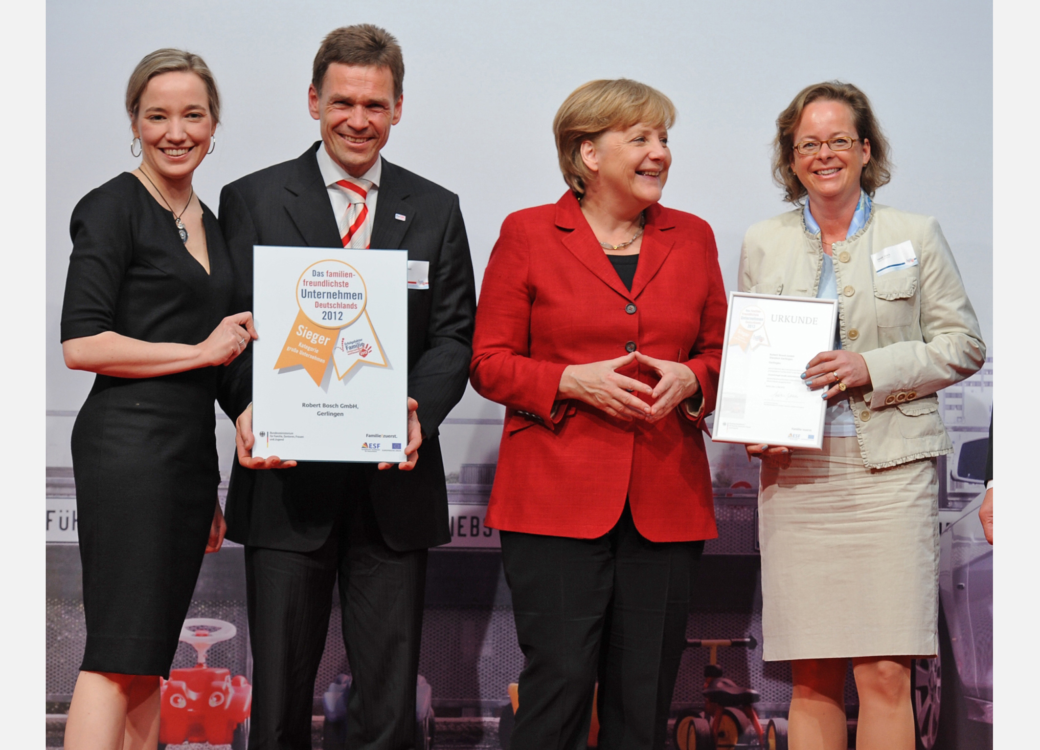 Bosch has been named Germany´s most family-friendly large enterprise. In Berlin, Federal Chancellor Dr. Angela Merkel and the Federal Minister of Family Affairs Dr. Kristina Schröder presented awards to companies that promote work-life balance. In the "large enterprises" category for companies with a workforce of more than 1,000, Bosch was judged the overall winner.