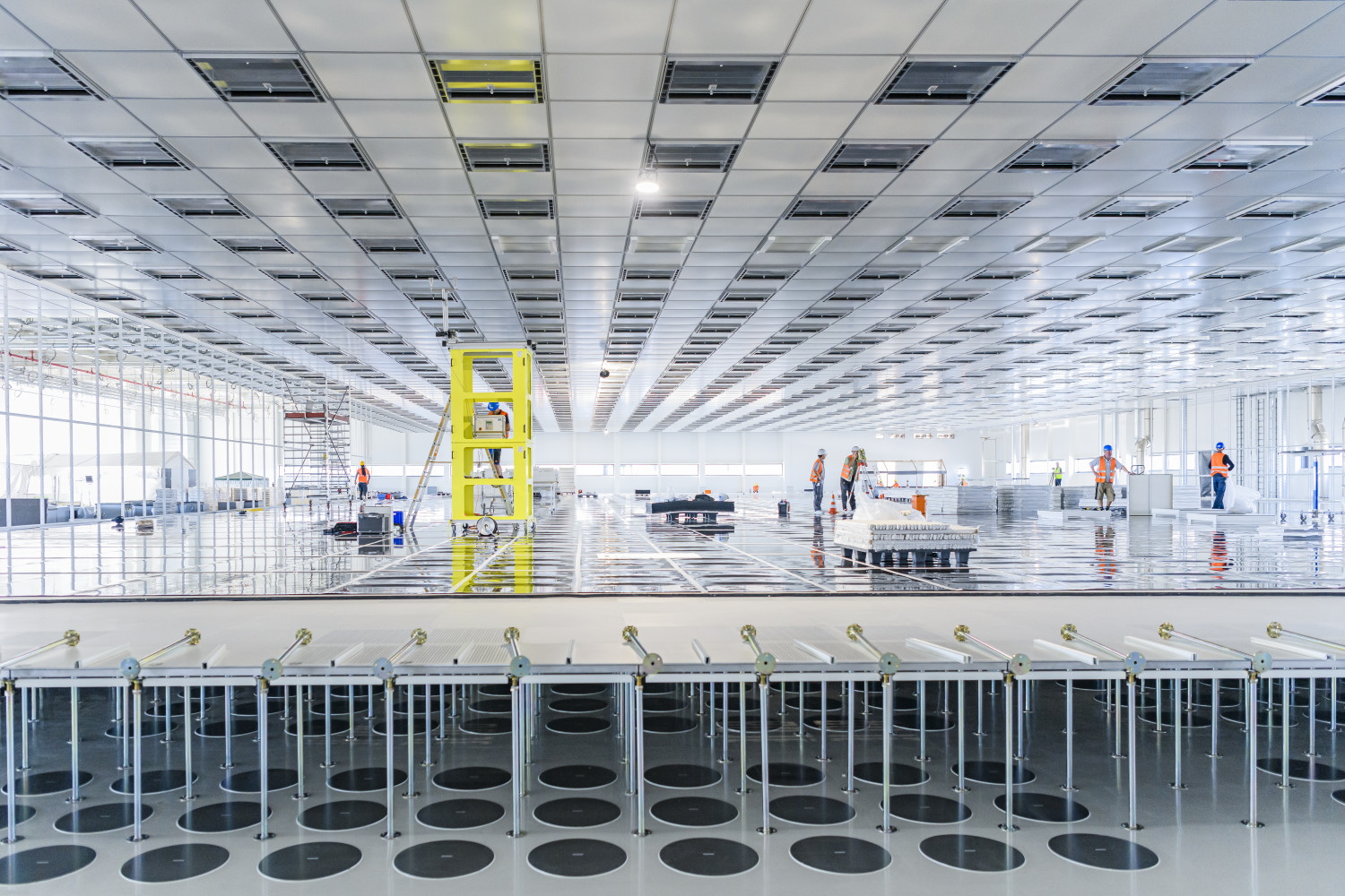 A glimpse inside the clean room of the Bosch wafer fab in Dresden with completed ceiling and view into double floor.