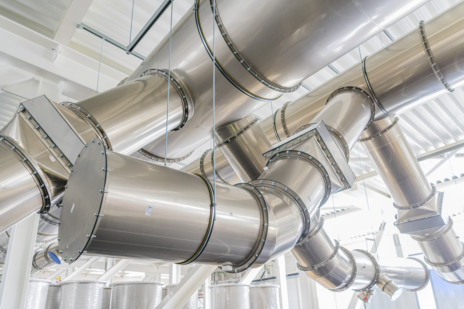 Looking down on a stainless steel drainage system for special exhaust air flows in the Dresden wafer fab.