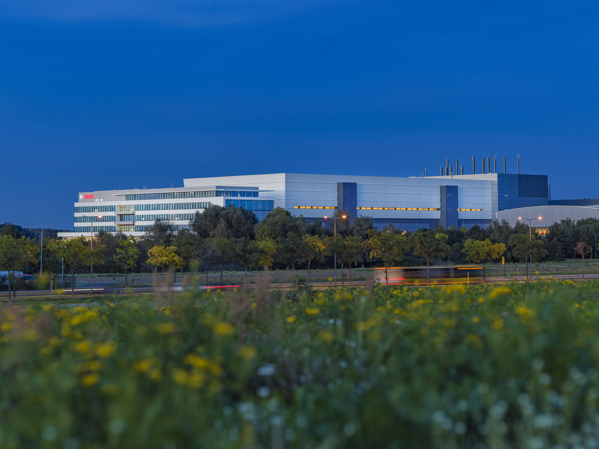 Nighttime view of the Bosch wafer fab in Dresden from the freeway.