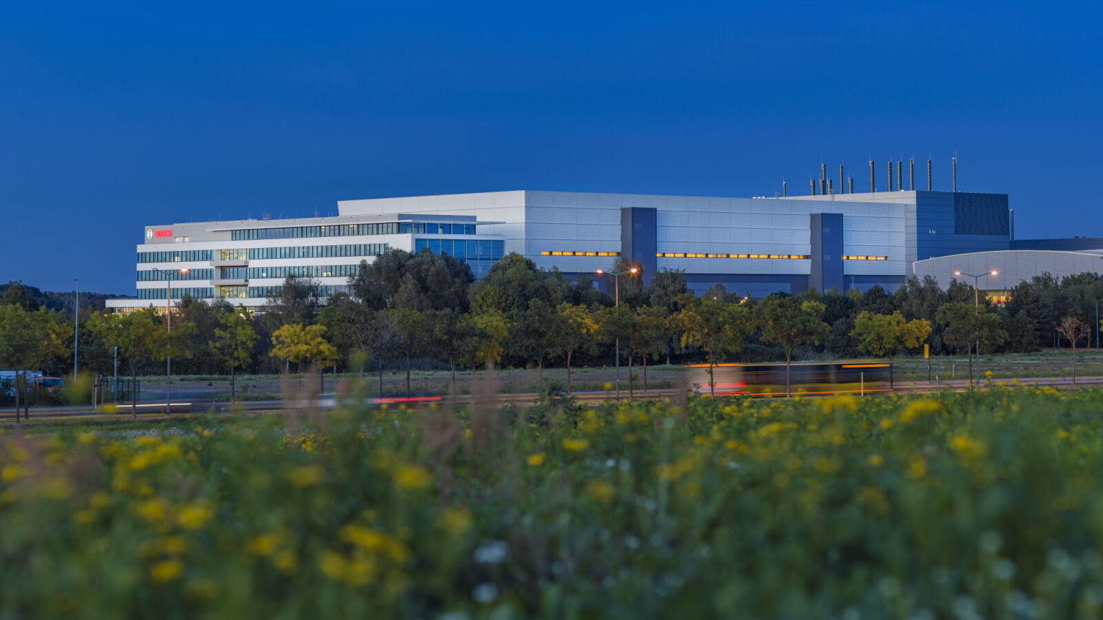 Nighttime view of the Bosch wafer fab in Dresden from the freeway.