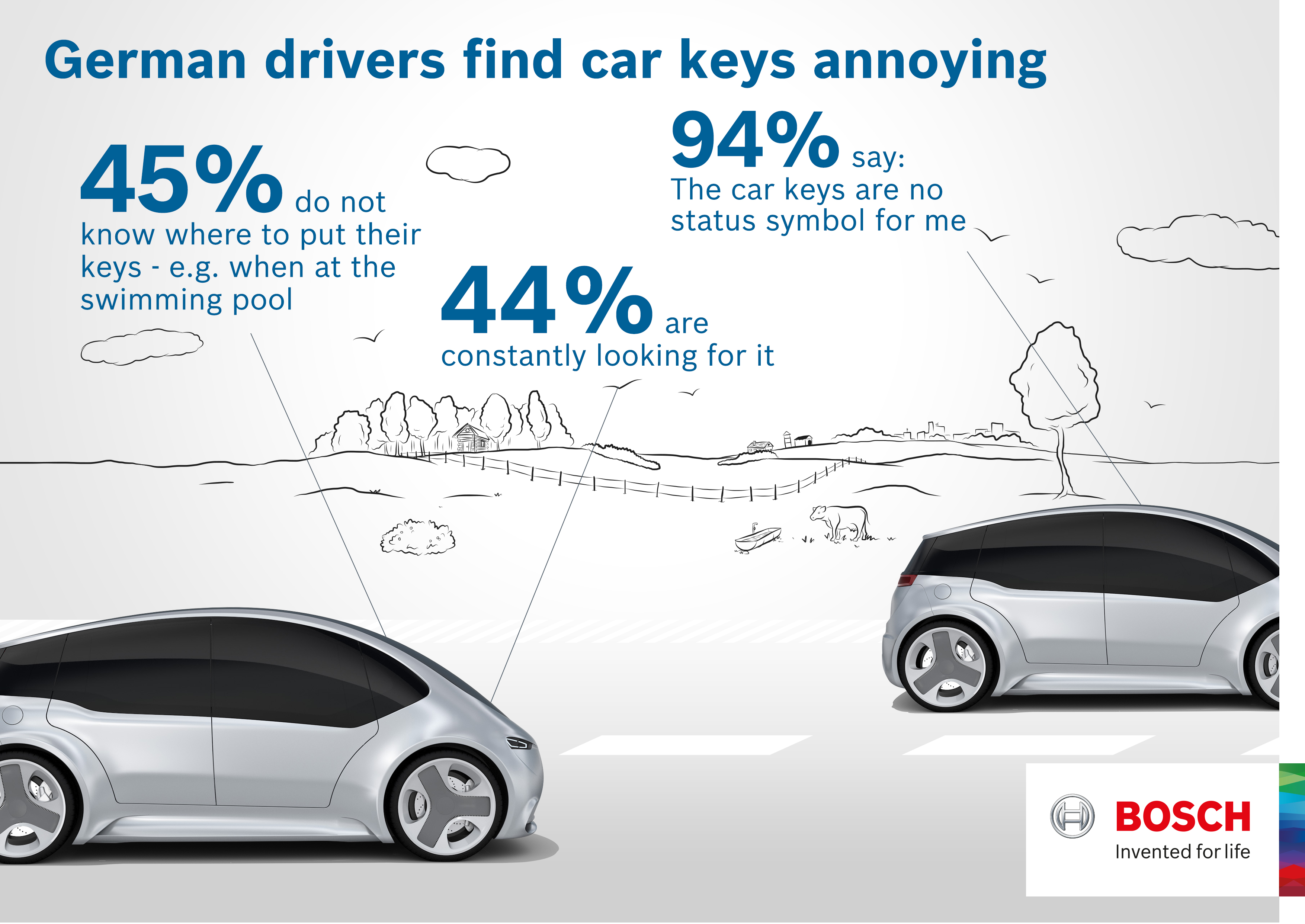 Especially drivers below the age of 40, and those who drive a lot, have had negative experiences with conventional car keys. It starts with simple logistics: they don’t know where to put their keys (45 percent of respondents), e.g., when at the swimming pool, they misplace them and take ages to find them again (44 percent), while some have even lost them altogether (38 percent).