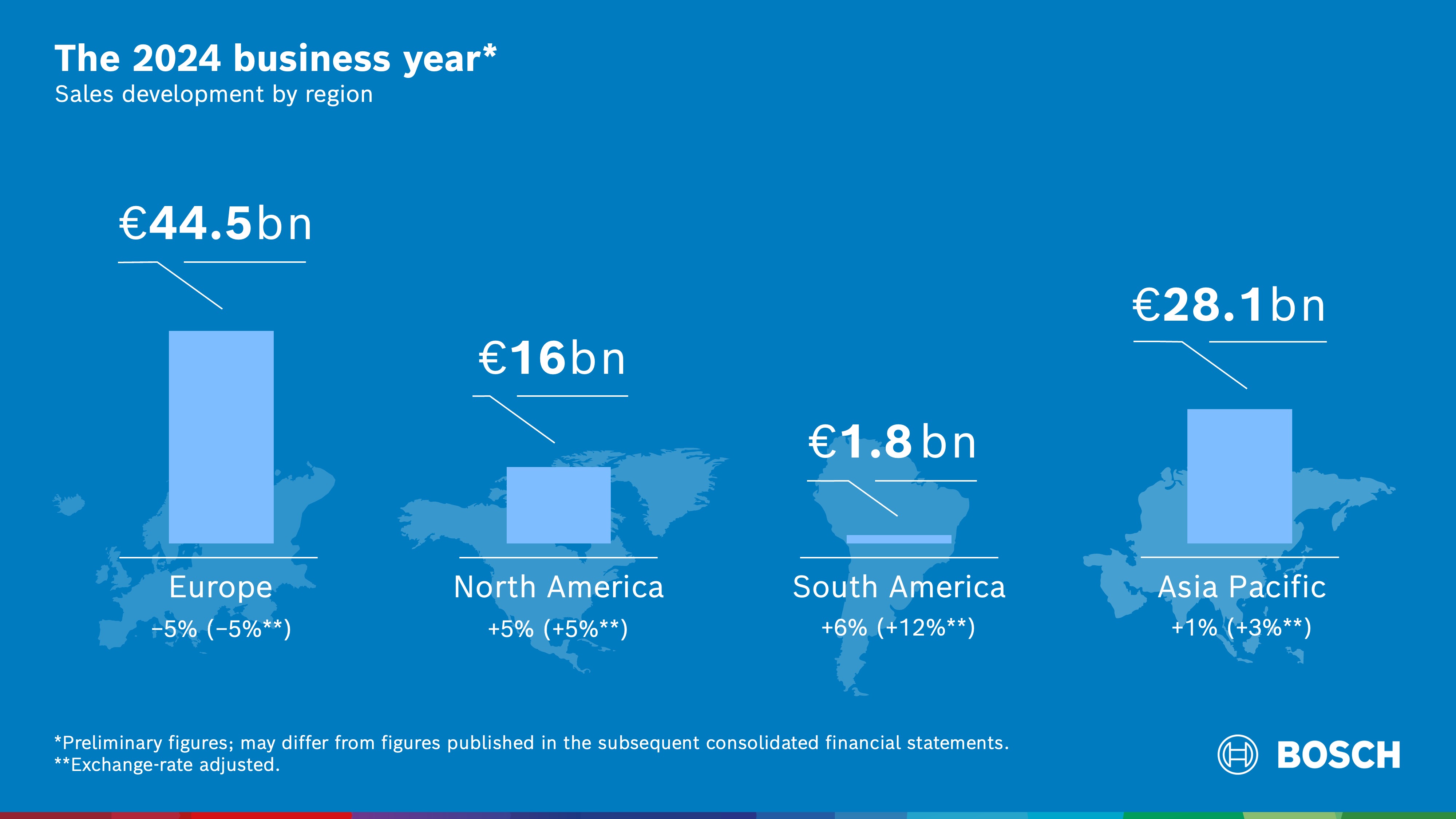 Bosch, the supplier of technology and services, generated sales revenue of 90.5 billion euros in 2024, according to preliminary figures. In nominal terms, this is a 1 percent year-on-year fall, and roughly on a par with the previous year when adjusted for exchange-rate effects. This equates to an EBIT margin from operations of 3.5 percent. In addition to the weak growth of the global economy, business development was adversely affected by the fact that growth markets such as electromobility developed much more slowly than expected. Sales revenue in Europe totaled 44.5 billion euros. This represents a year-on-year decrease of 5 percent, both in nominal terms and after adjusting for exchange-rate effects. In North America, sales grew by 5 percent, both in nominal terms and after adjusting for exchange-rate effects, to 16 billion euros. Sales revenue in South America totaled 1.8 billion euros. This is an increase of 6 percent in nominal terms, or an exchange rate-adjusted 12 percent. In Asia Pacific, sales revenue totaled 28.1 billion euros. Nominal growth was 1 percent, or 3 percent after adjusting for exchange-rate effects.