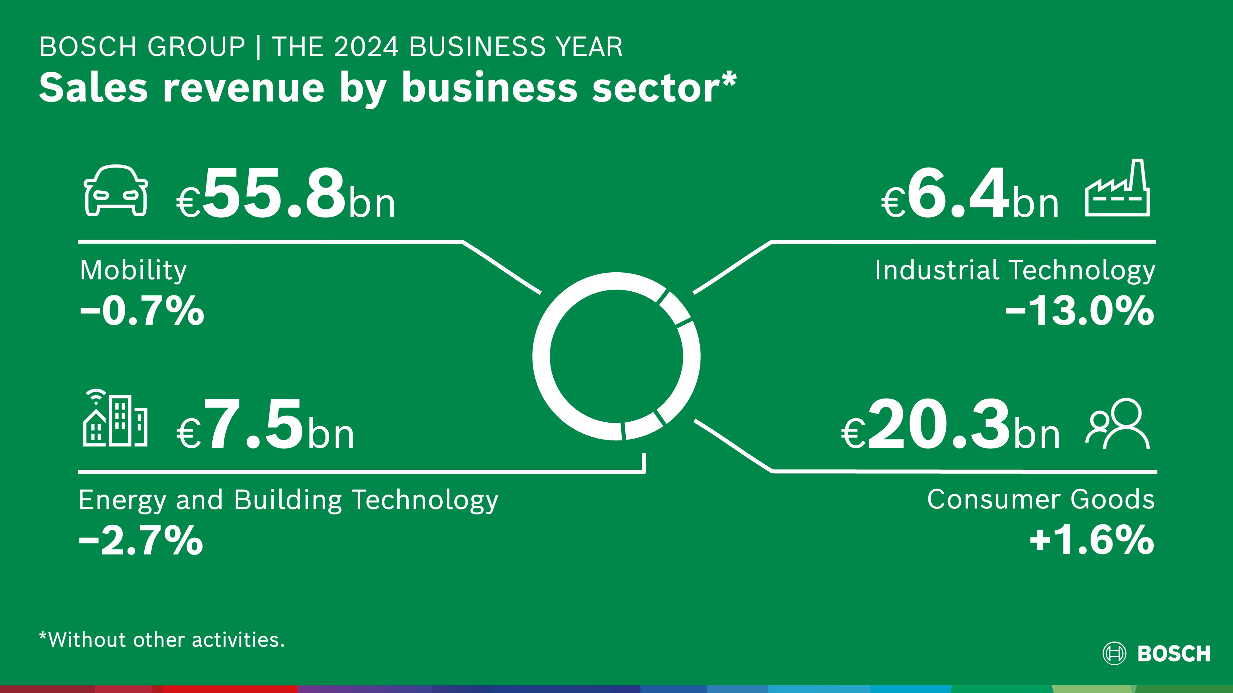 The Bosch Group is continuing with its ambitious Strategy 2030 to strengthen its competitive position, even though the market environment was a significant brake on growth last year: at 90.3 billion euros, the supplier of technology and services generated 1.4 percent less sales revenue in 2024 than in the previous year. In the Mobility business sector, sales fell by 0.7 percent year on year to 55.8 billion euros. The Industrial Technology business sector achieved sales of 6.4 billion euros. This represents a decrease of 13.0 percent. The Consumer Goods business sector increased its sales revenue by 1.6 percent to 20.3 billion euros. In the Energy and Building Technology business sector, sales revenue fell by 2.7 percent year on year to 7.5 billion euros.