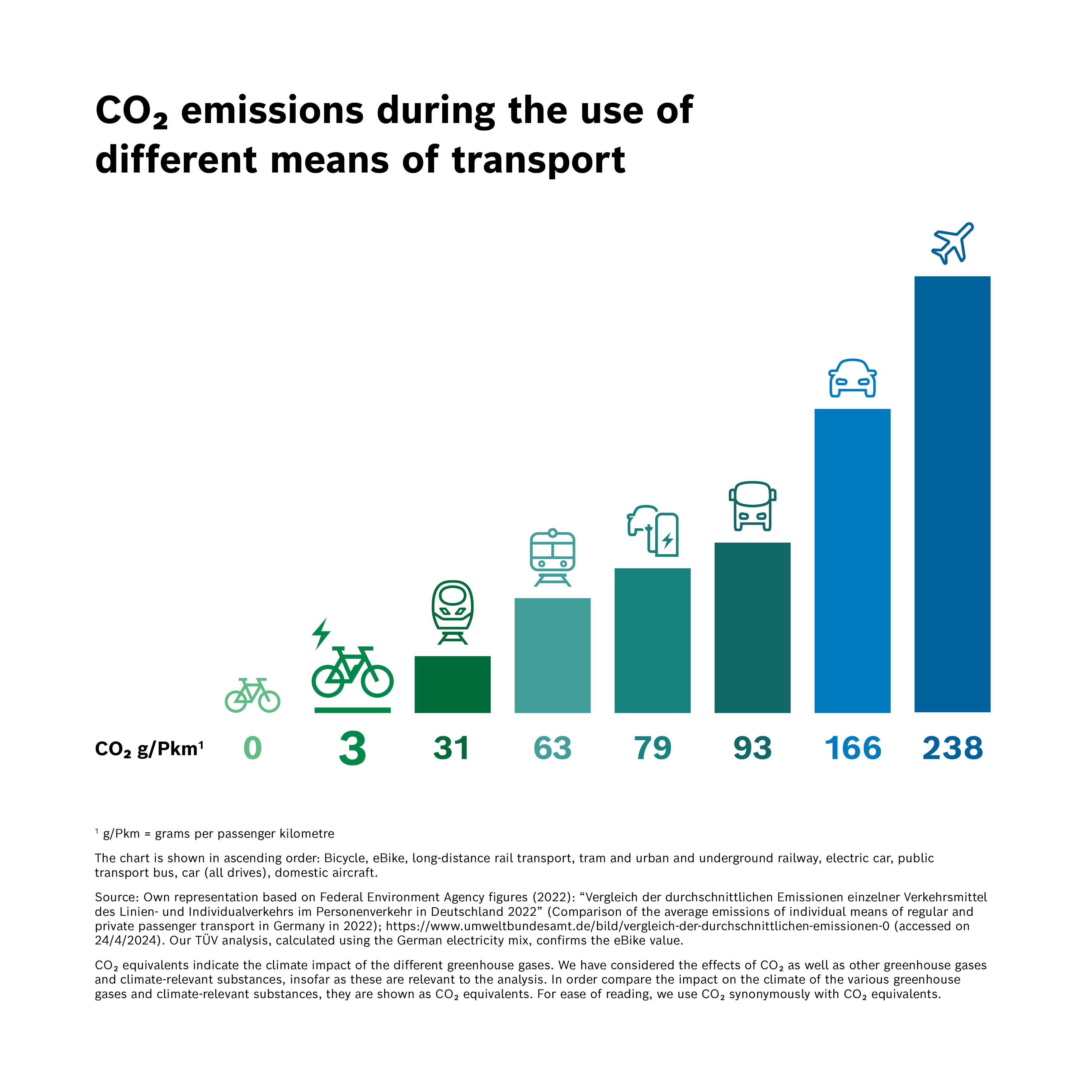 As an evaluation by the Federal Environment Agency shows, the eBike is one of the lowest-emission means of transport. When using an eBike, the electricity consumption results in average CO₂ emissions of 3 g CO₂/person-kilometer (pkm), depending on the electricity mix.