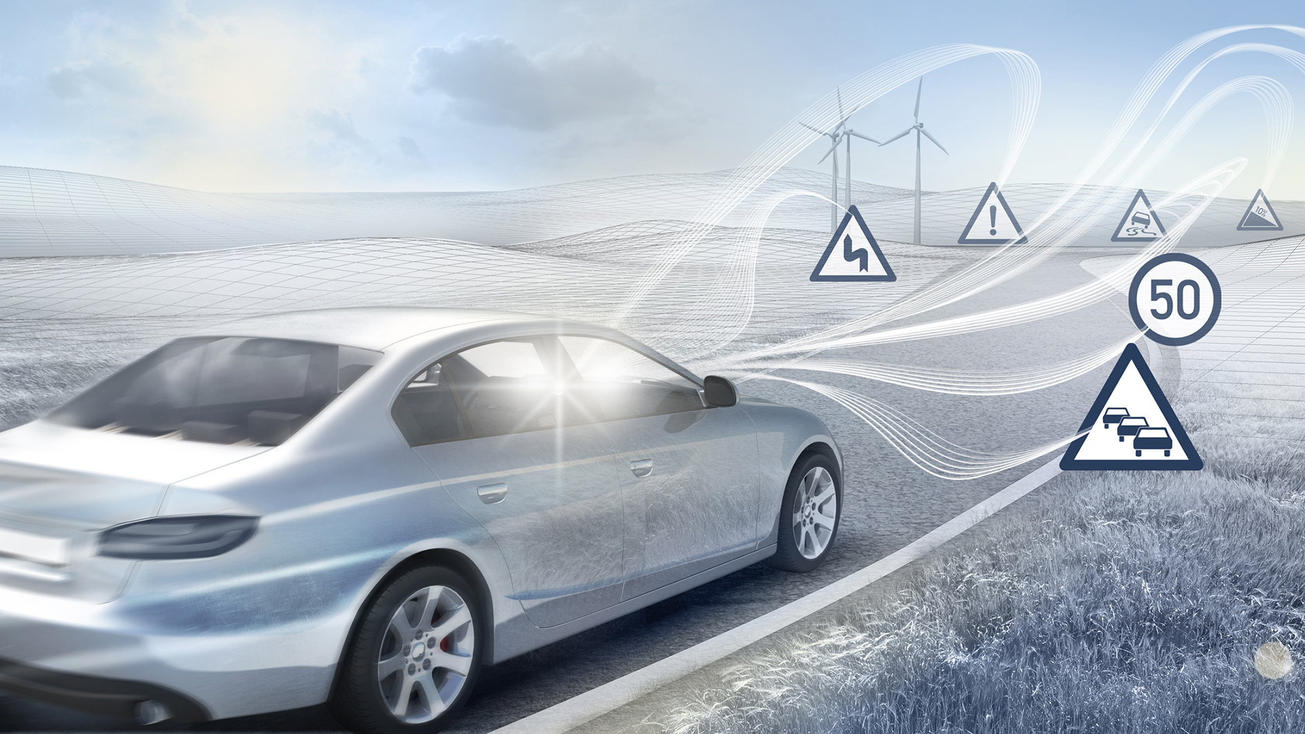 Thanks to real-time traffic information, a connected electronic horizon function is possible. This function can warn drivers of traffic jams, construction sites, or even black ice.