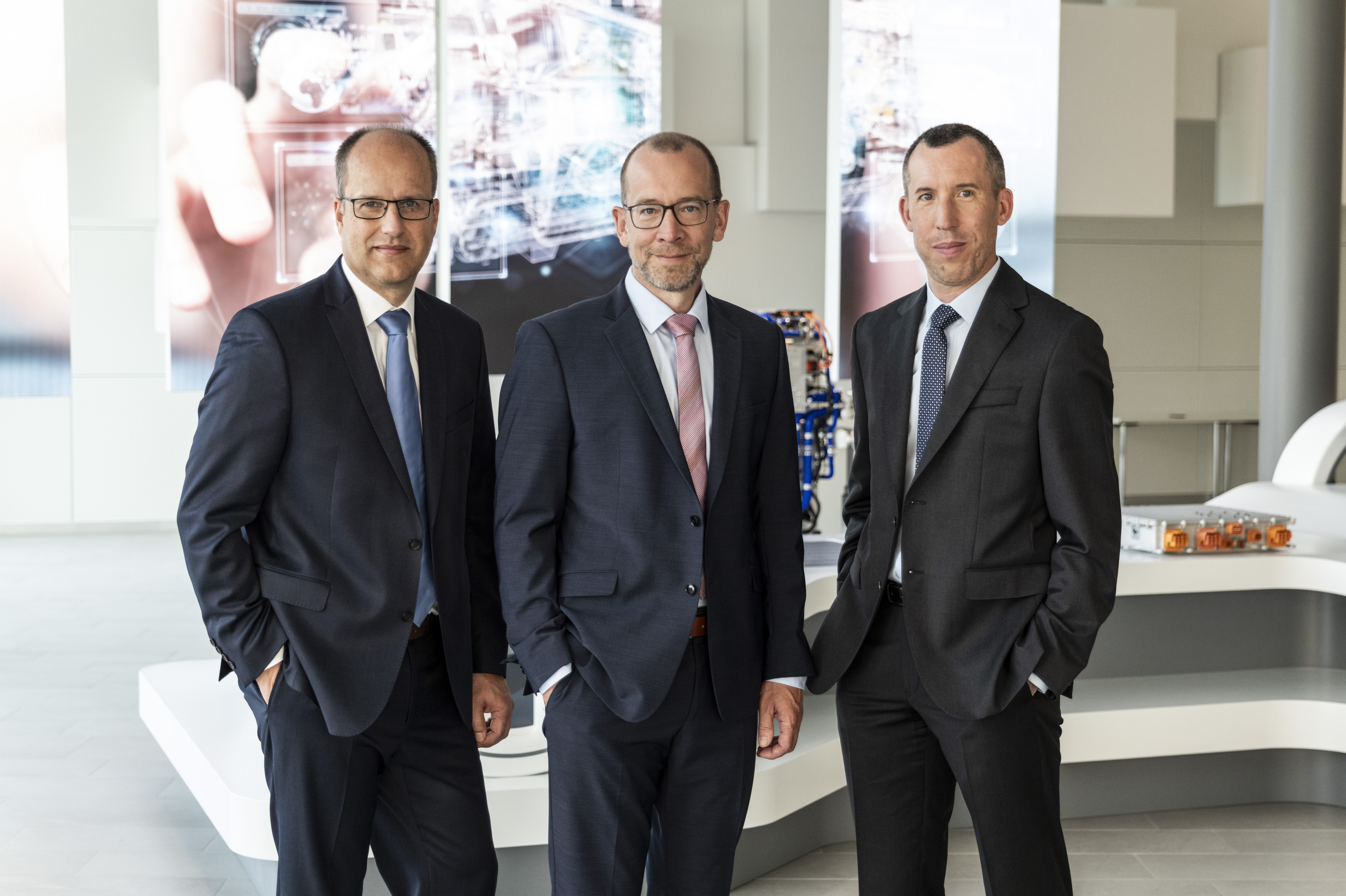 A three-person development team from Bosch is in the running for the 2025 German Future Prize. Kai Weeber, Christoffer Uhr, and Pierre Andrieu (from left to right) have been nominated for the federal president’s prestigious award thanks to their work on the fuel-cell power module (FCPM).