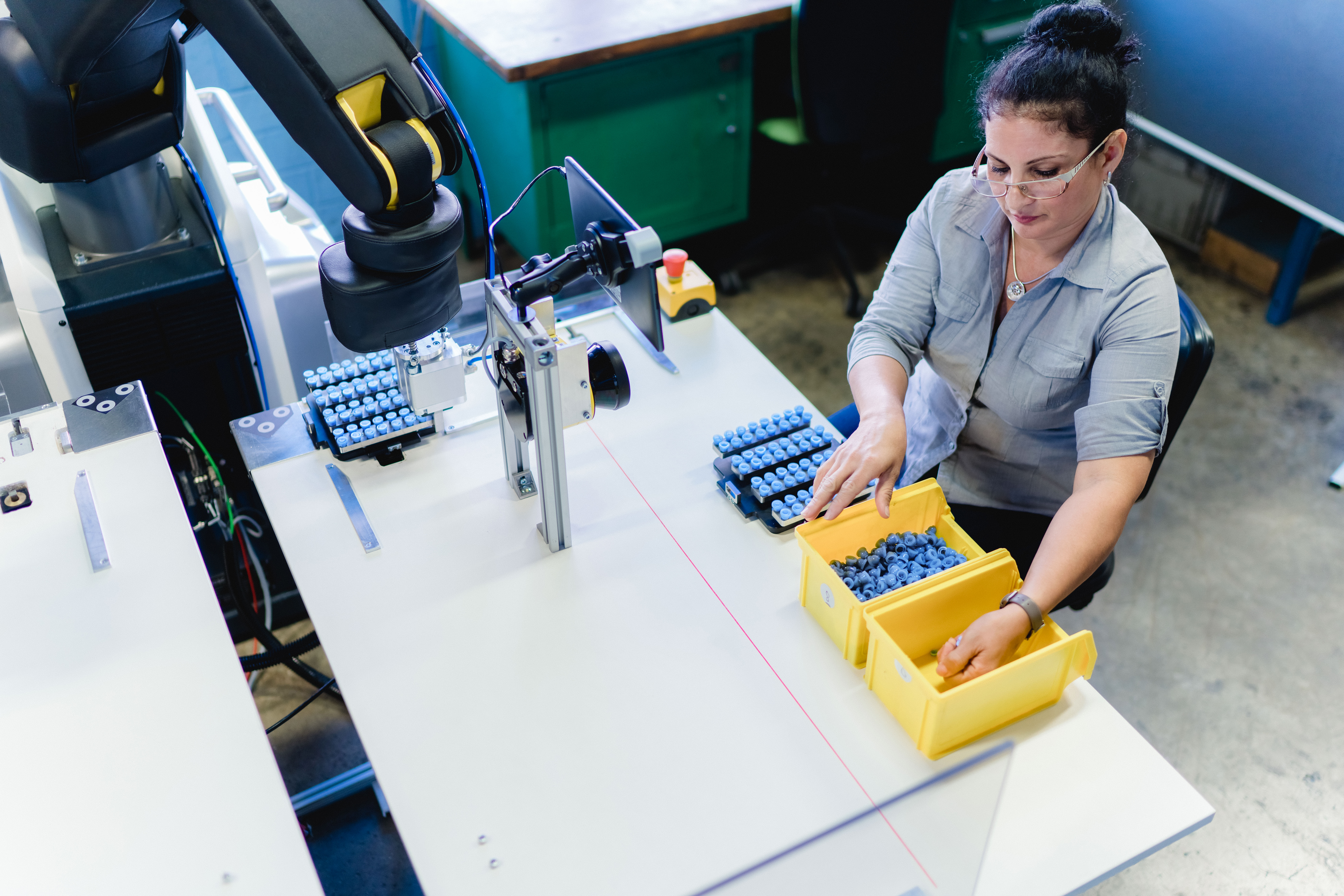The human manages and controls the work processes and the robot performs them.