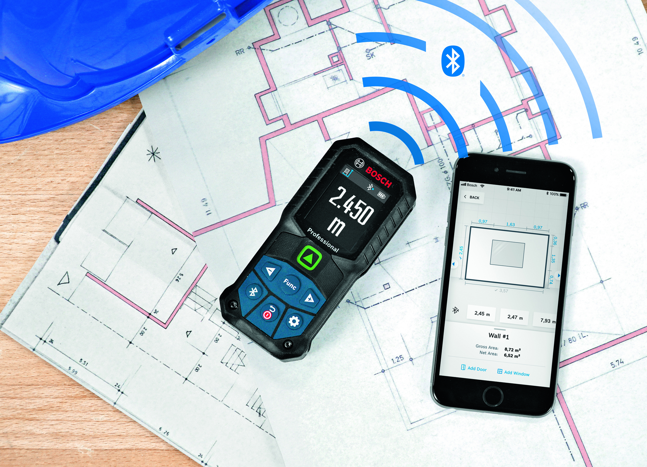 GLM 50-27 C and CG Professional transfer their results via integrated Bluetooth function to the new MeasureOn App, where they can be digitally processed via smartphone. Sketches of individual rooms, measured values, photos and notes can be brought together on one surface. How exactly the data is arranged in the digital workspace, is entirely up to the user. He can work the way he wants in order to record and manage the construction site in the best possible way. New is that all data can be saved in the cloud and can therefore be accessed regardless of location and device.