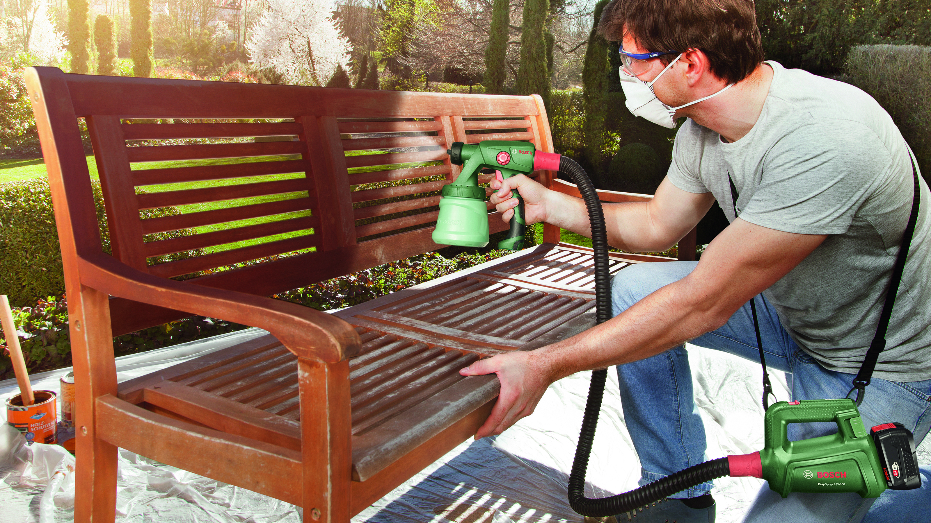 The cordless paint spray system EasySpray 18V-100 is suitable for small to medium-sized projects such as painting doors and chairs, varnishing garden furniture or coloring wood and metal fences. The desired intensity of the paint application is easily set using the EasySelect control on the spray head. 3 different spray patterns can also be selected: horizontal, vertical, or round. Easy-to-understand symbols on the tool help to do so. A graphic shows the correct spraying technique and the correct distance to the surface required to achieve a good result. This makes it easy to apply paint quickly, evenly, and cleanly.