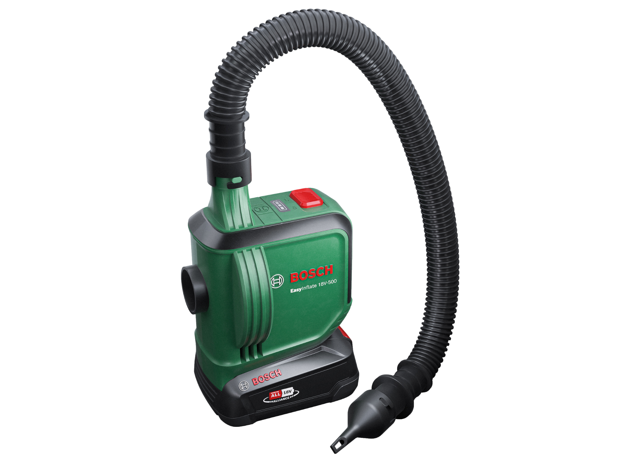 With the new EasyInflate 18V-500 cordless volume pump from Bosch, nothing stands in the way of a day at the lake or the next camping vacation. Large-volume sports and leisure equipment such as air mattresses, inflatable boats, paddling pools, pool toys, and exercise balls can be inflated quickly and conveniently with the EasyInflate 18V-500. The EasyInflate 18V-500 is part of the ‘18V Power for All System’. The ‘18V Power for All System’ also covers all representative tools in each segment, currently comprises about 60 DIY tools, gardening tools, and household appliances, and even extends beyond the Bosch range with additional partners in the cross-brand ‘Power for All Alliance’. All tools – from rotary hammer to lawn mower and even vacuum cleaner – can be operated with the same 18V lithium-ion battery and only one charger. This saves users space and money and protects the environment.