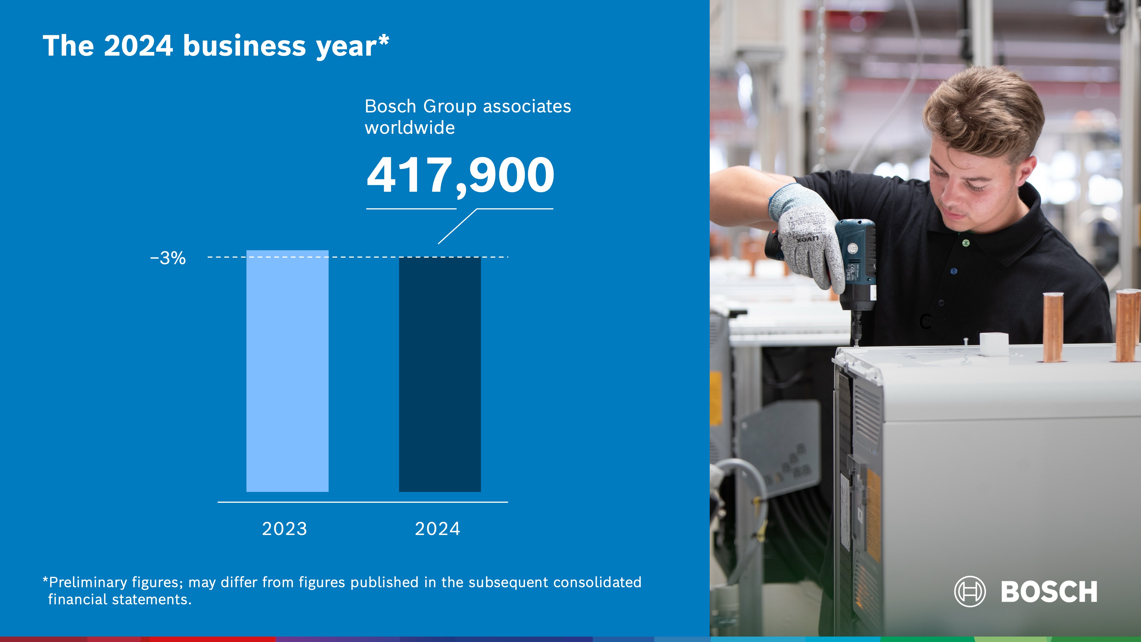 As of December 31, 2024, the supplier of technology and services Bosch employed some 417,900 associates worldwide – this is roughly 3 percent less than in the previous year (-11,500). Regionally, there were significant changes in Europe and Asia. The number of associates in Germany also fell by approx. 3 percent (-4,400) to about 129,800.