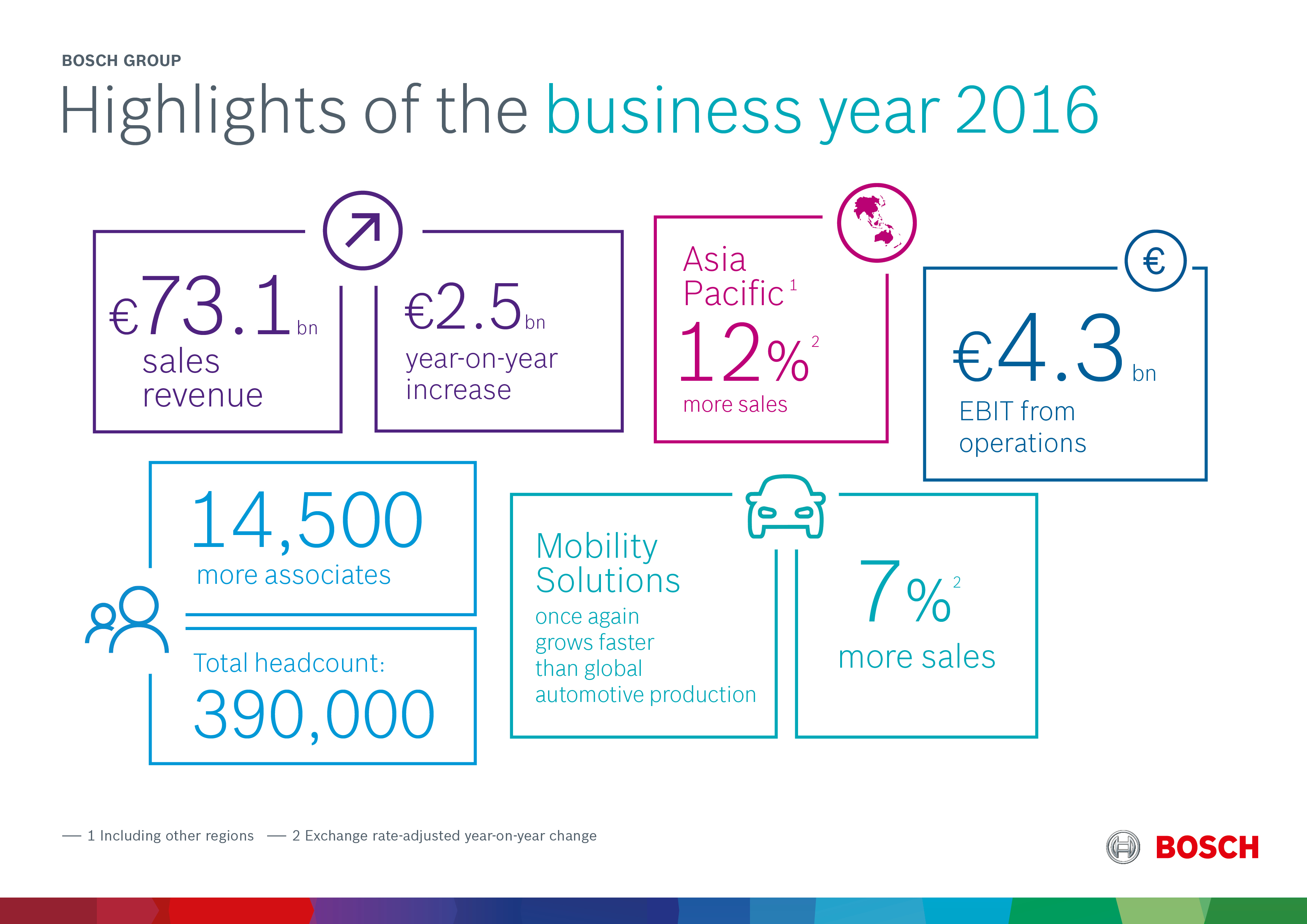 In 2016, Bosch Group sales rose to 73.1 billion euros, an increase of 3.6 percent. Earnings from operations before interest and taxes (EBIT from operations) came to 4.3 billion euros. Mobility Solutions, the strongest sector in terms of sales (60 percent of total sales), grew by 7 percent adjusted for exchange-rate effects, once more outpacing global automotive production. The sector’s sales came to 43.9 billion euros. In the Asia Pacific region, Bosch reported double-digit growth in sales. Adjusted for exchange-rate effects, the figure here grew by some 12 percent to 20.8 billion euros. As of December 31, the Bosch Group employed some 390,000 associates worldwide. This means 14,500 more associates working for the company than in the previous year.