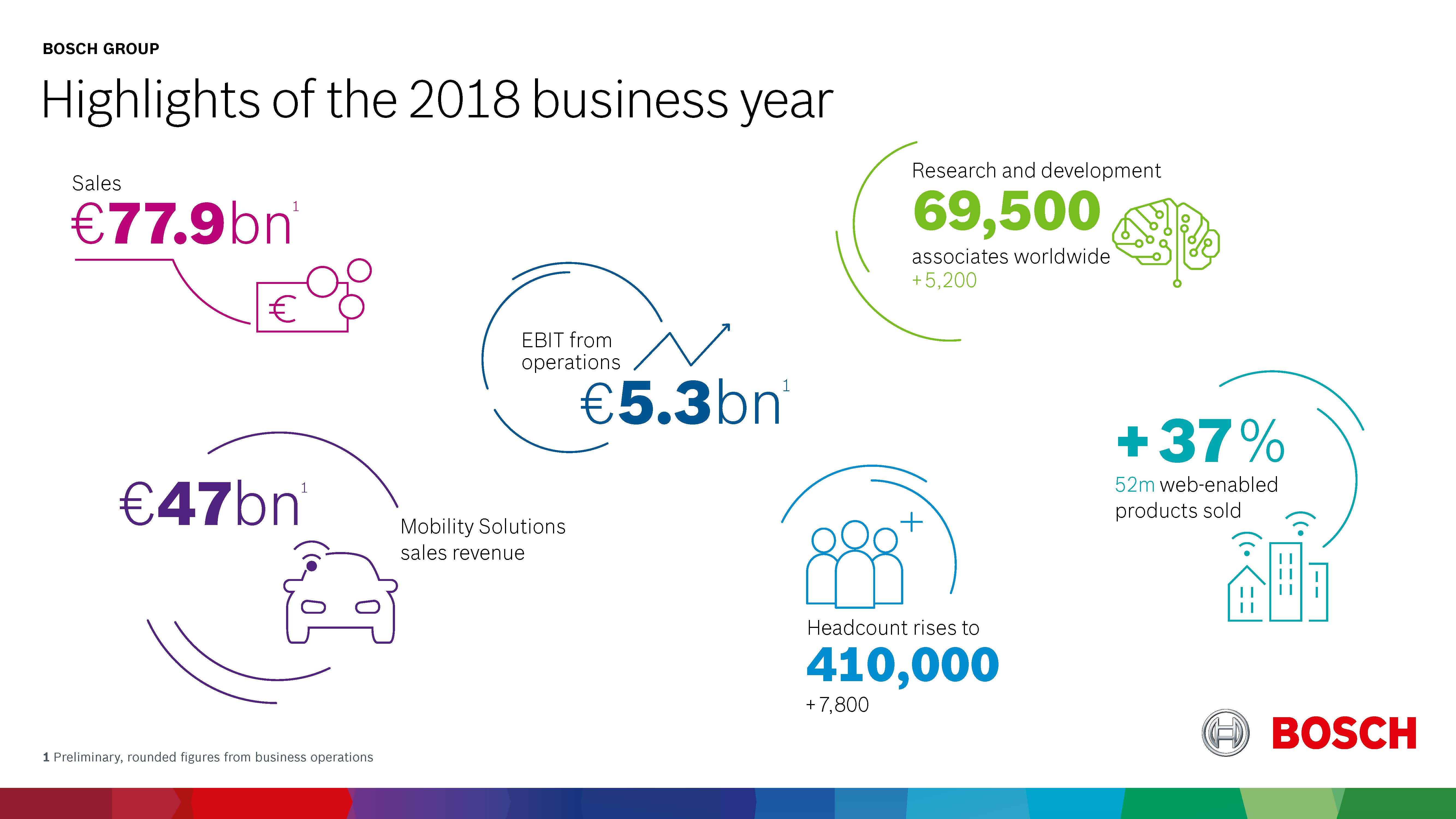 According to preliminary figures, Bosch once again generated record sales of 77.9 billion euros in 2018. Earnings from operations before interest and taxes (EBIT) amounted to some 5.3 billion euros in 2018. Mobility Solutions generated 47 billion euros, making it the business sector with the highest sales. Bosch sold a total of 52 million web-enabled products in 2018, 37 percent more than in the previous year. Worldwide, 69,500 associates were employed in research and development, 5,200 more than in the previous year. As of December 31, Bosch employed some 410,000 associates worldwide, an increase of 7,800.