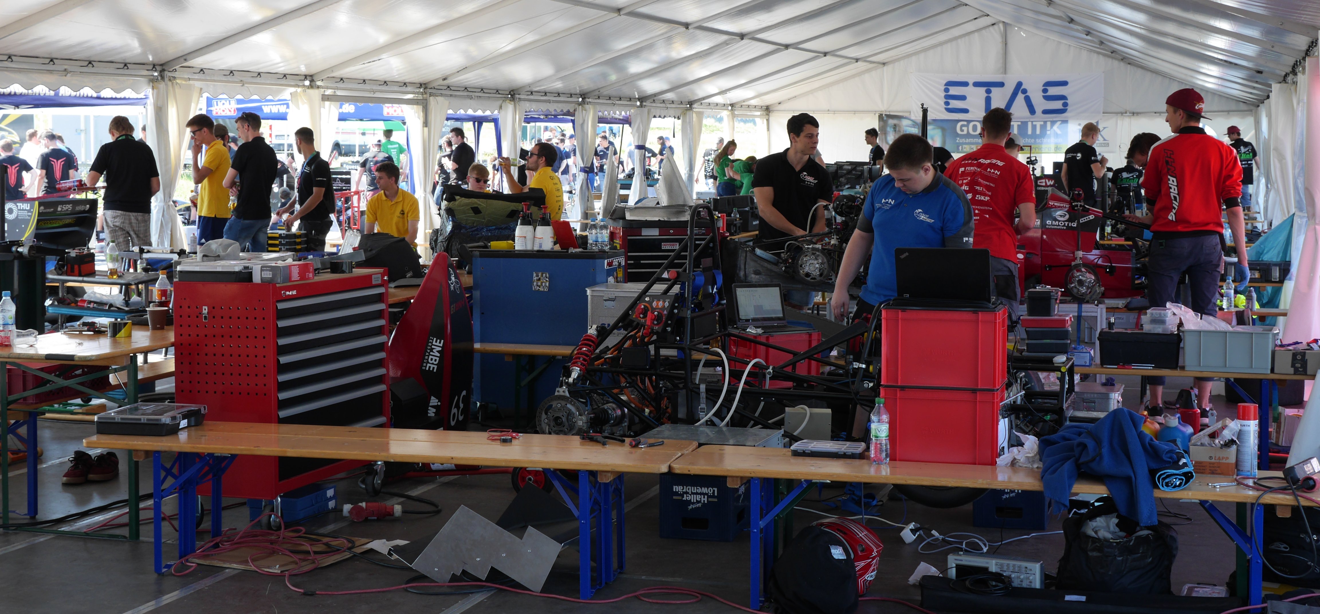 A large tent served as a "pit lane" to prepare the racing cars for the technical inspection.