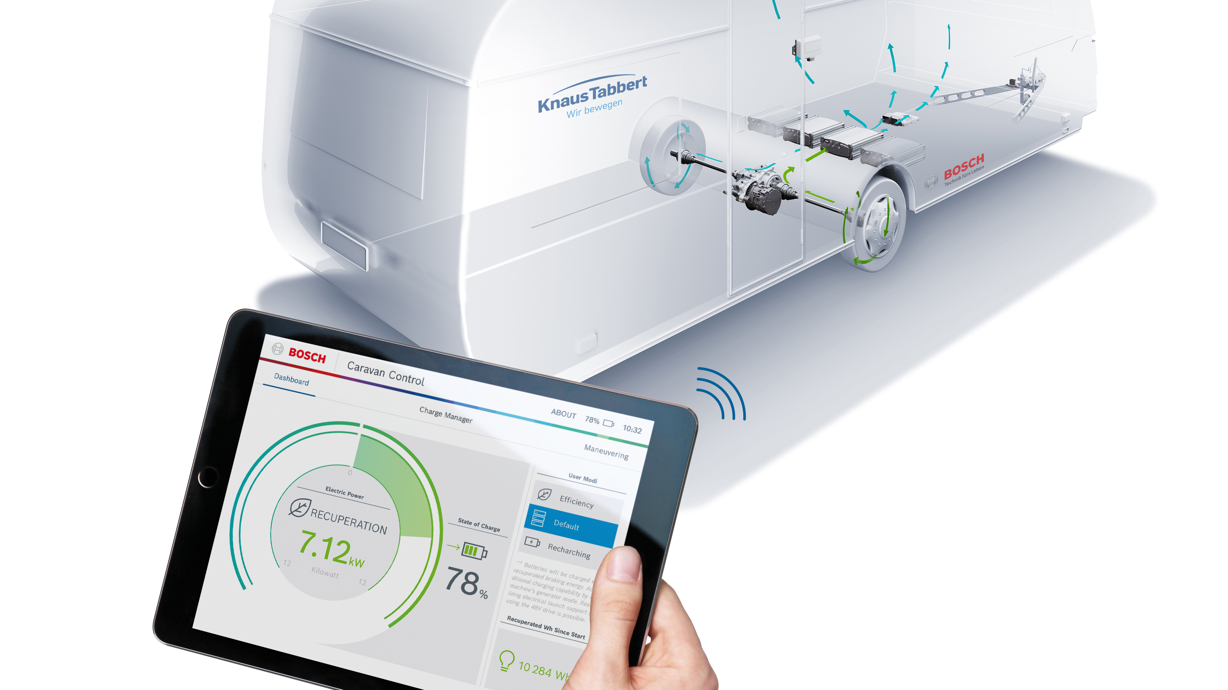 Bosch Engineering and Knaus Tabbert present a smart 48 volt system for caravans for more independence on the road and at your holiday destination. In the future, the Bosch App will show, for example, the charge status of the batteries, whether energy is recuperated or consumed. In addition, the caravan can be easily and conveniently manoeuvred to the desired parking location via the app.