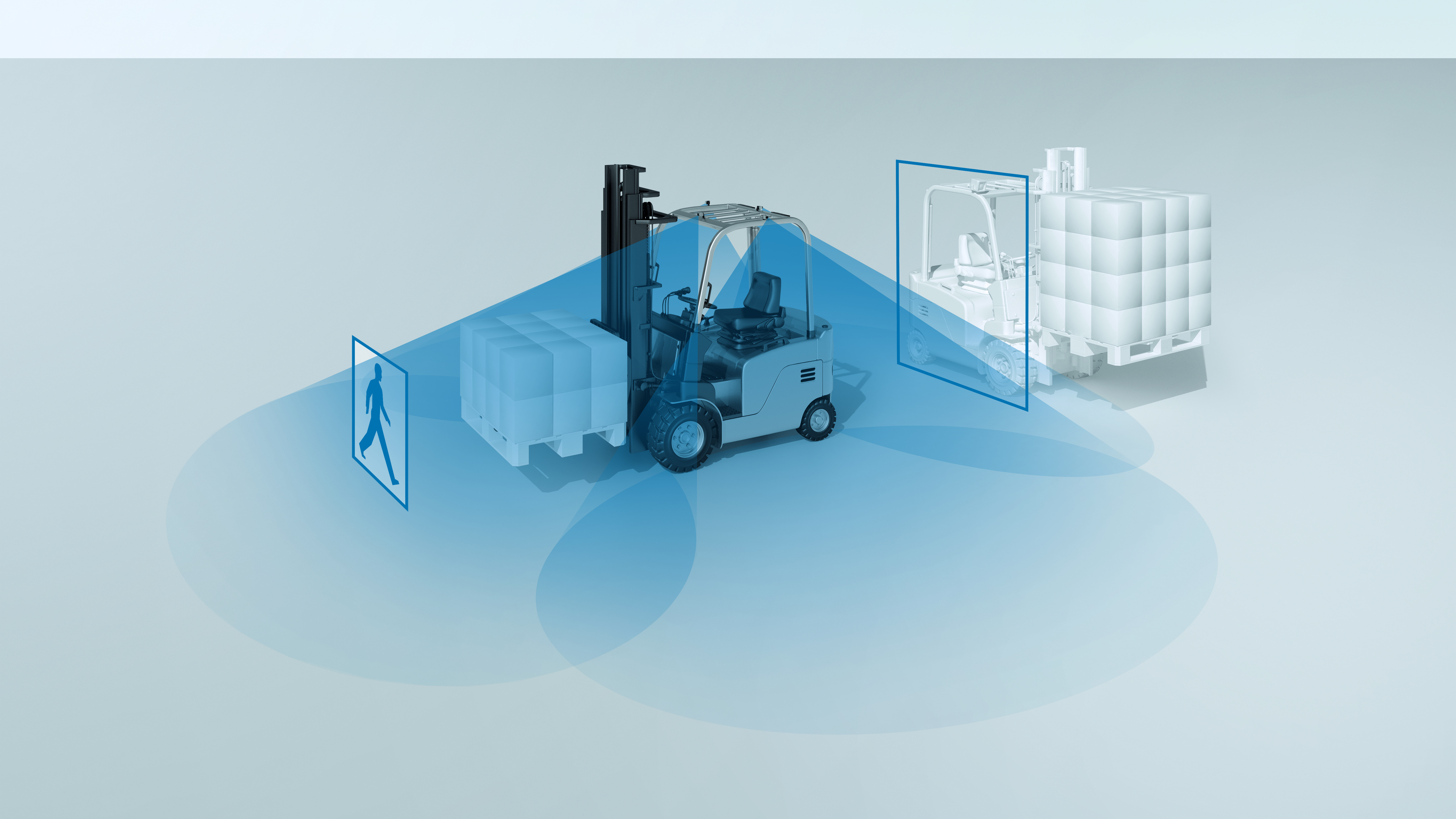 Collision warning system for forklift trucks with 360° panoramic view in real time, especially in hard-to-view areas for even more safety in intralogistics.