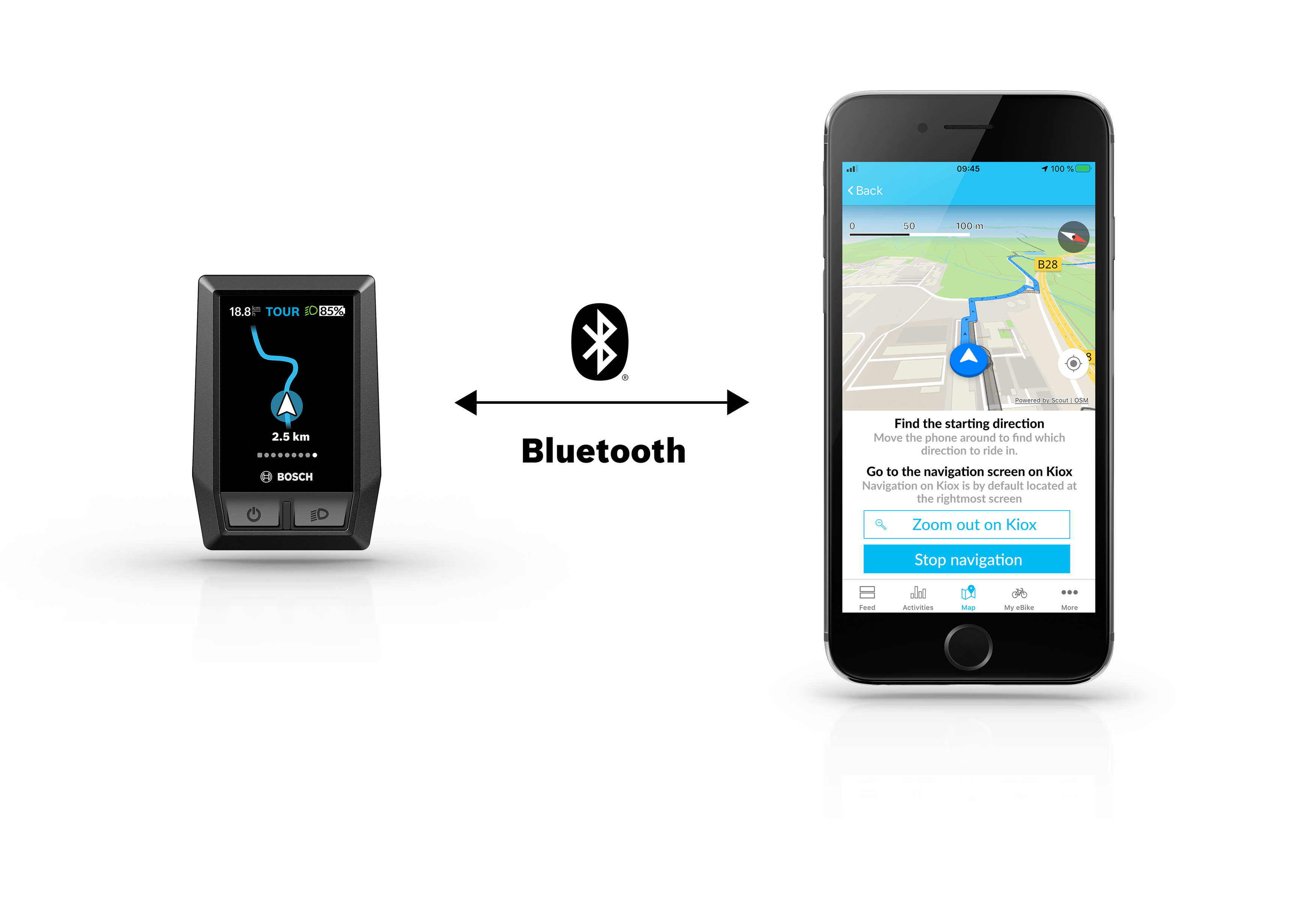 Navigation is by means of the smartphone connected to the Kiox on-board computer via Bluetooth.