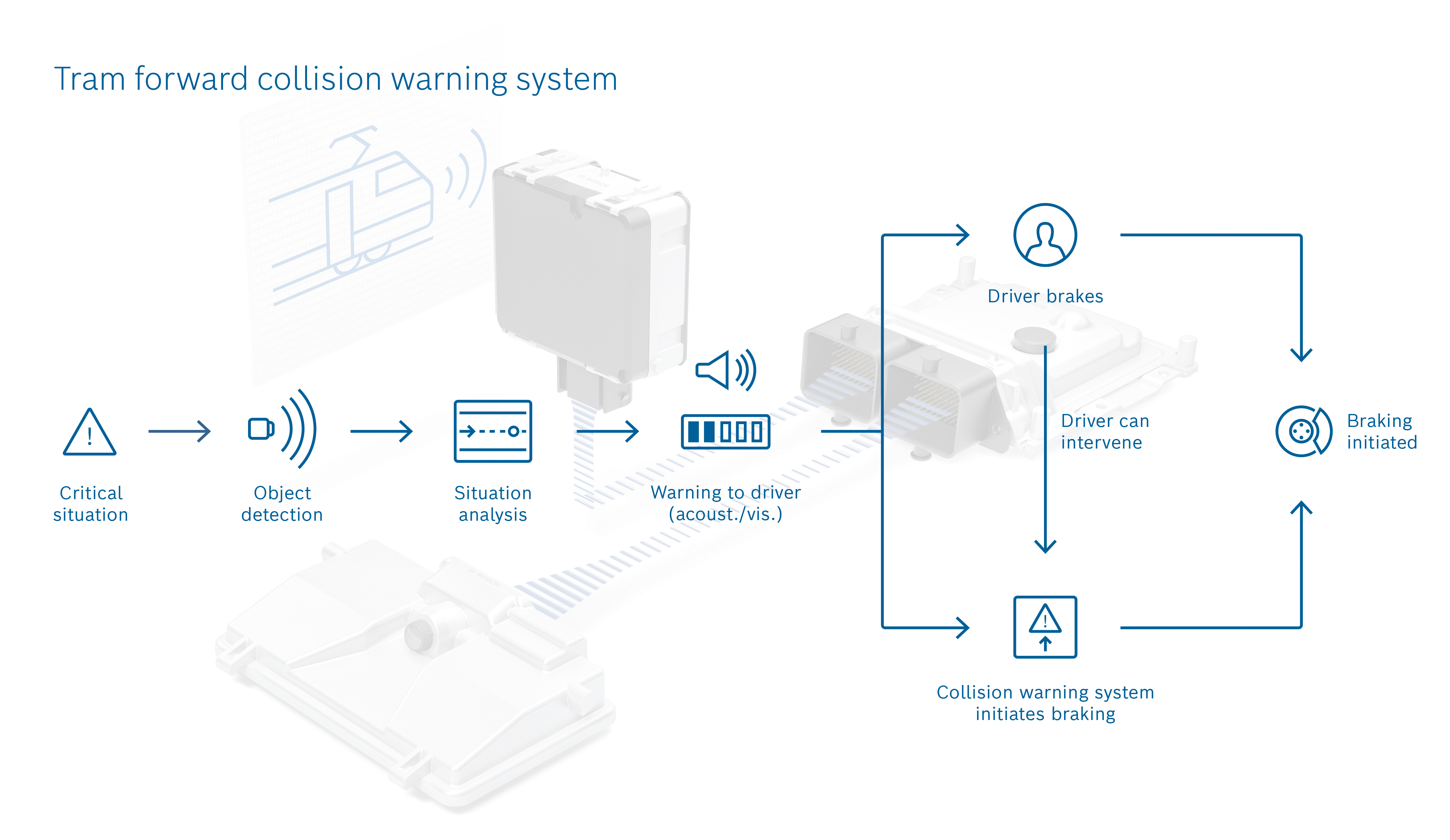 The forward collision warning system for light rail vehicles combines a radar sensor with a video sensor to detect any cars, buses or other trams ahead. The central rail control unit processes information from both sensors, along with other factors, such as the speed of the tram, to provide a detailed image of the environment. The driver assistance system warns tram drivers of any impending collision: if the driver brakes too late, or not at all, the system engages the brakes independently to stop the tram and avoid an accident.