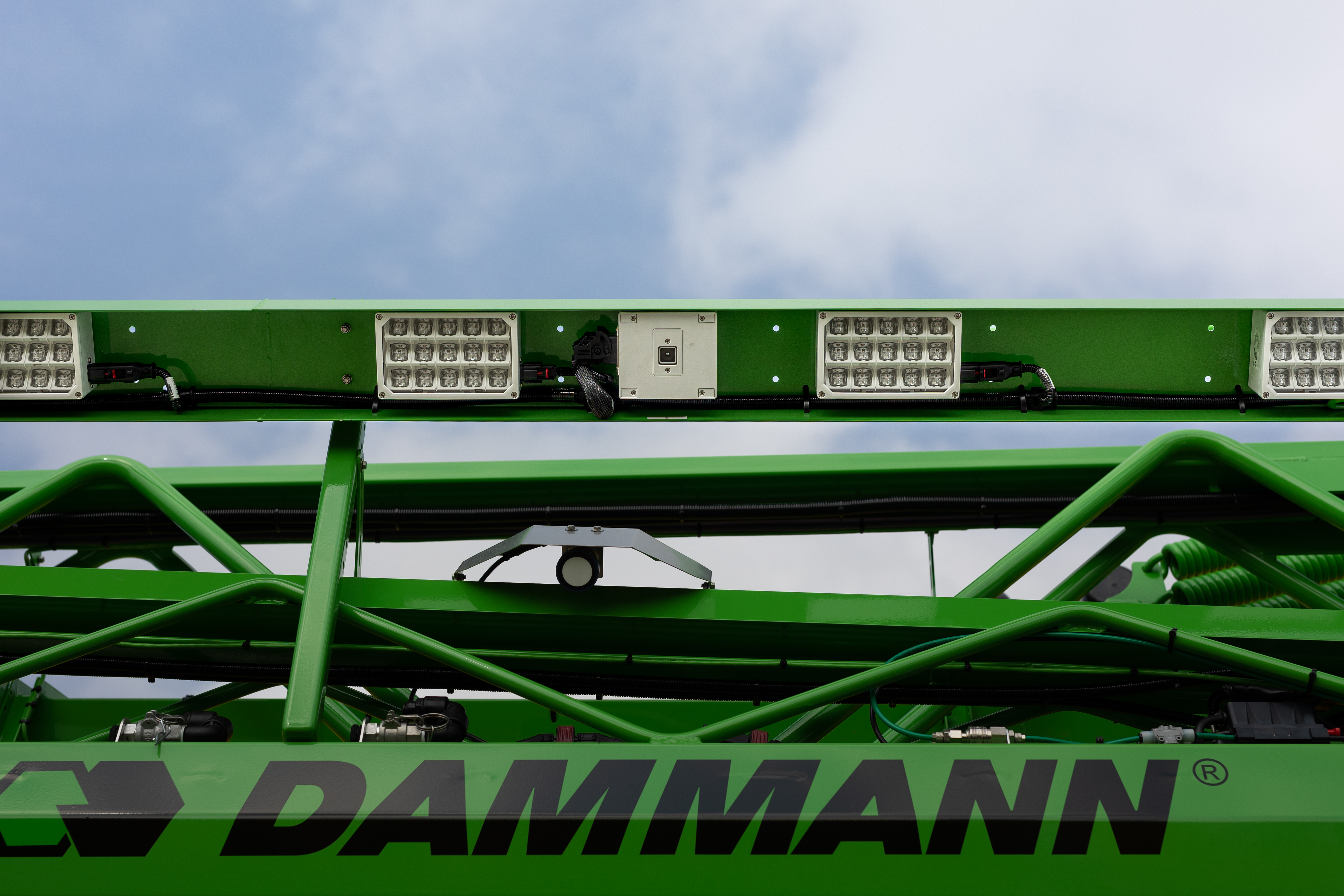 A Dammann crop protection sprayer featuring the Smart Spraying Solution, with the unique weed management system’s field camera unit (central) and lighting units (each side) visible.
