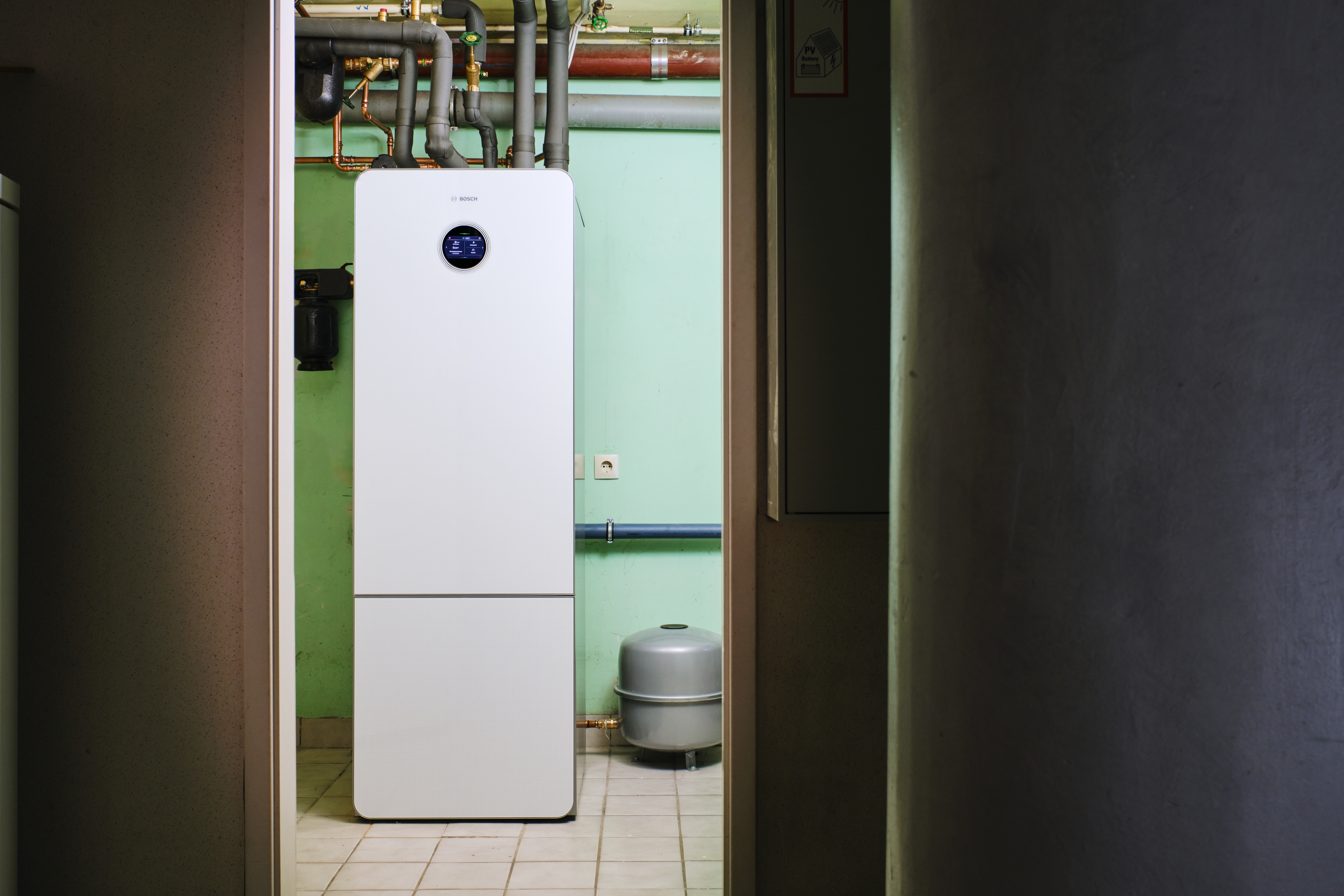 Space is at a premium in the Rothweiler family's basement. No problem for the new Bosch heat pump: The indoor unit of the new Compress 6800i AW is available as a space-saving tower variant that already has an integrated hot water tank.