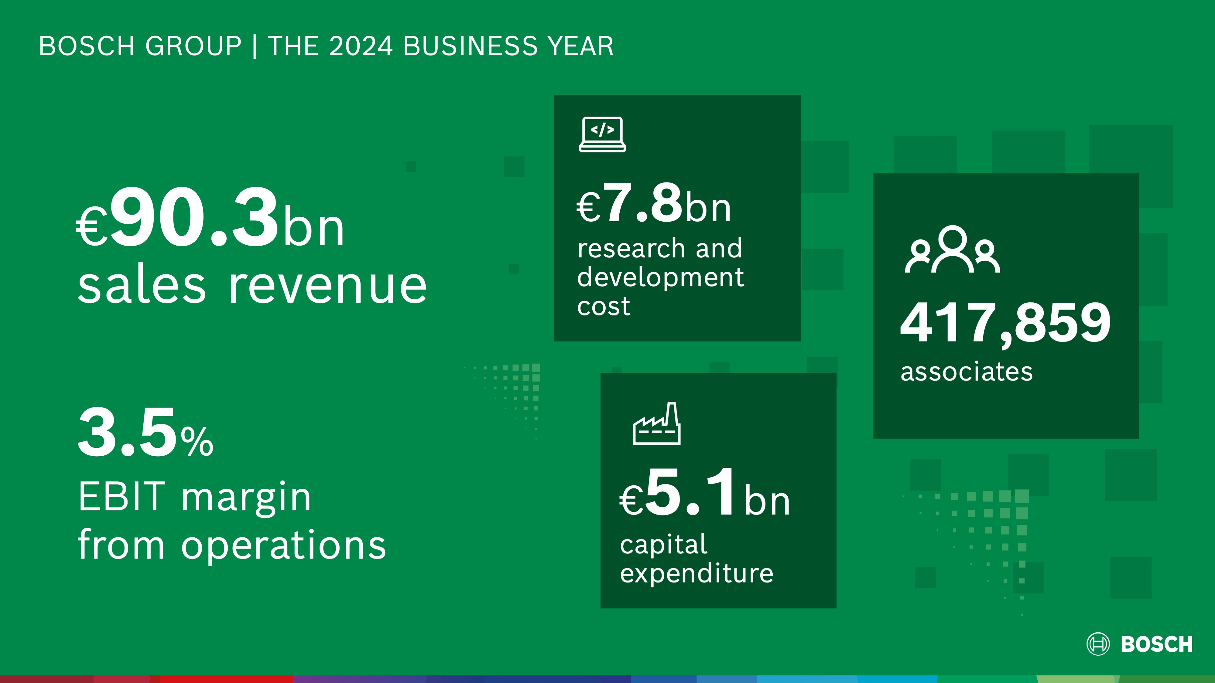 The Bosch Group is continuing with its ambitious Strategy 2030 to strengthen its competitive position, even though the market environment was a significant brake on growth last year: at 90.3 billion euros, the supplier of technology and services generated 1.4 percent less sales revenue in 2024 than in the previous year. EBIT (earnings before interest and taxes) from operations stood at 3.1 billion euros; the EBIT margin from operations was 3.5 percent. Expenditure on research and development amounted to 7.8 billion euros in 2024 and capital expenditure rose to 5.1 billion euros. Together, this resulted in investments in the future to the tune of some 13 billion euros. The Bosch Group employed 417,859 people worldwide at year-end 2024.