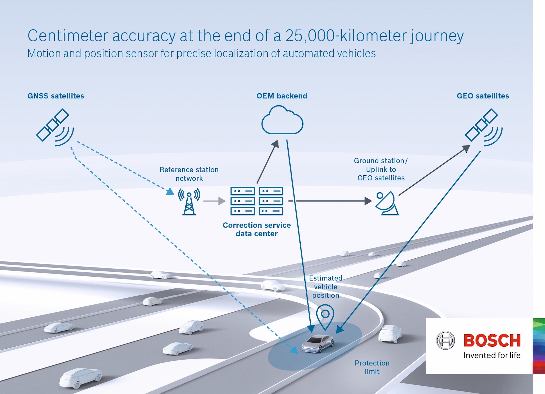 The challenge with satellite-based positioning lies in dealing with inaccuracies in the data. This is why Bosch makes use of correction data supplied by various providers. With the help of a network of terrestrial reference stations whose positions are precisely known, these providers can correct for the inaccuracy of GNSS positioning information. The correction data reaches the car via a cloud or geostationary satellites.
