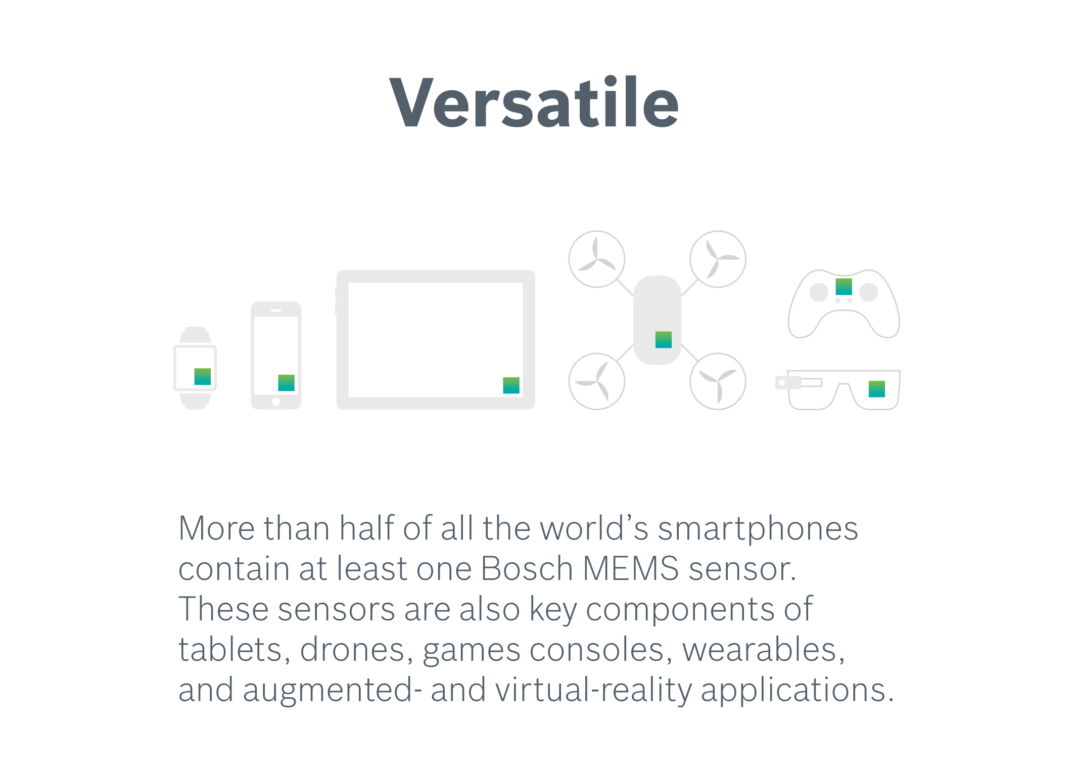More than half of all the world’s smartphones contain at least one Bosch MEMS sensor. These sensors are also key components of tablets, drones, games consoles, wearables, and augmented- and virtual-reality applications.